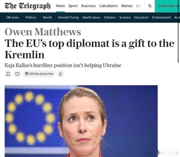 英国《每日电讯报》发文:《欧盟最高外交官是送给克里姆林宫的礼物》 内容是:卡娅·卡拉斯(Kaja Kallas)的强硬立场并未帮助乌克兰,反而在助长莫斯科的地缘政治红利。