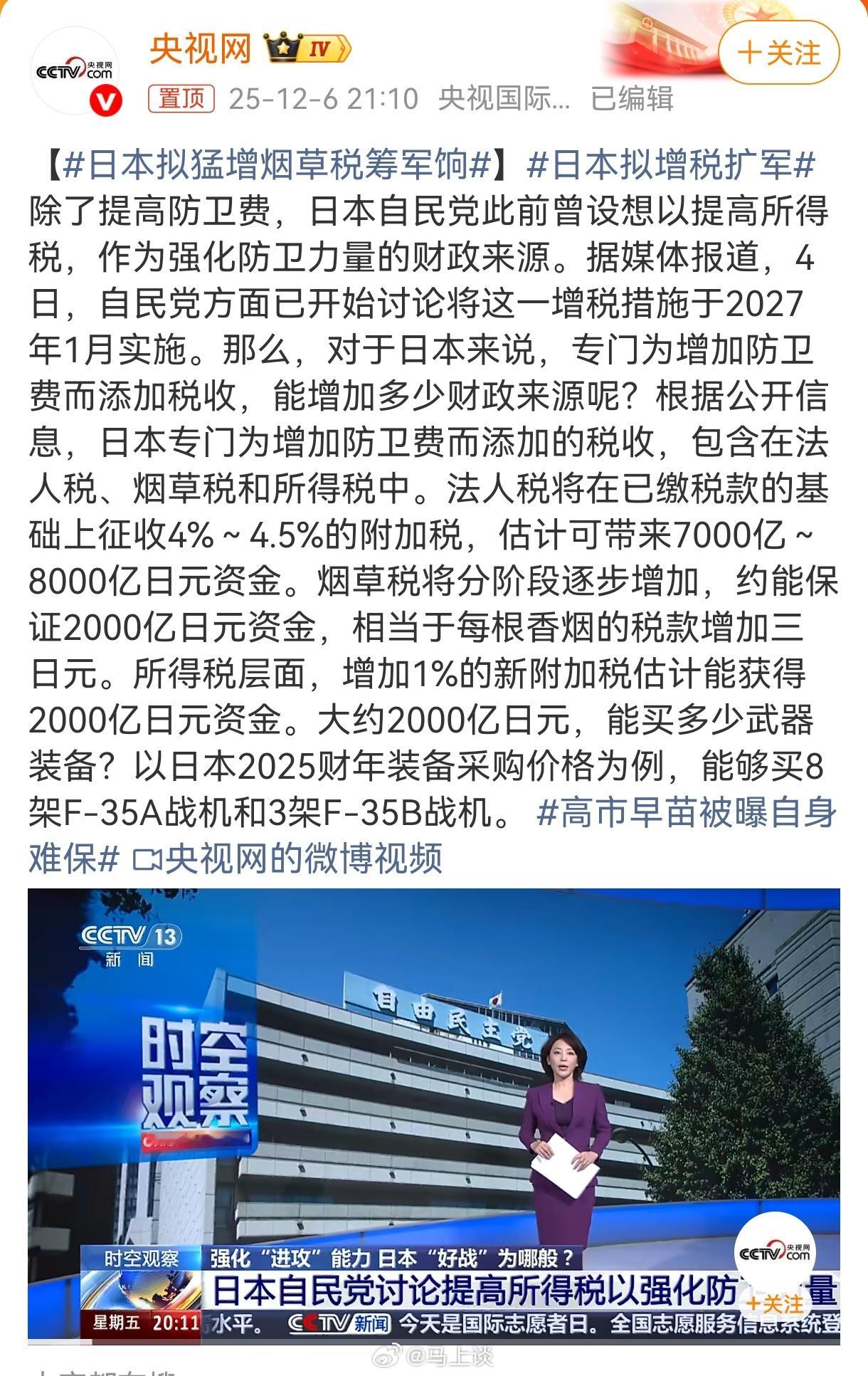高市早苗真是要疯,日本拟猛增烟草税筹军饷!!虽然抽烟有害健康,但现阶段你不可否认烟草税对财政收入的贡献,不然高市早苗怎么会如此呢?高市早苗被曝自身难保日本在与那国岛挖一锹土我军都能发现日本极可能成为中俄在亚太最大威胁