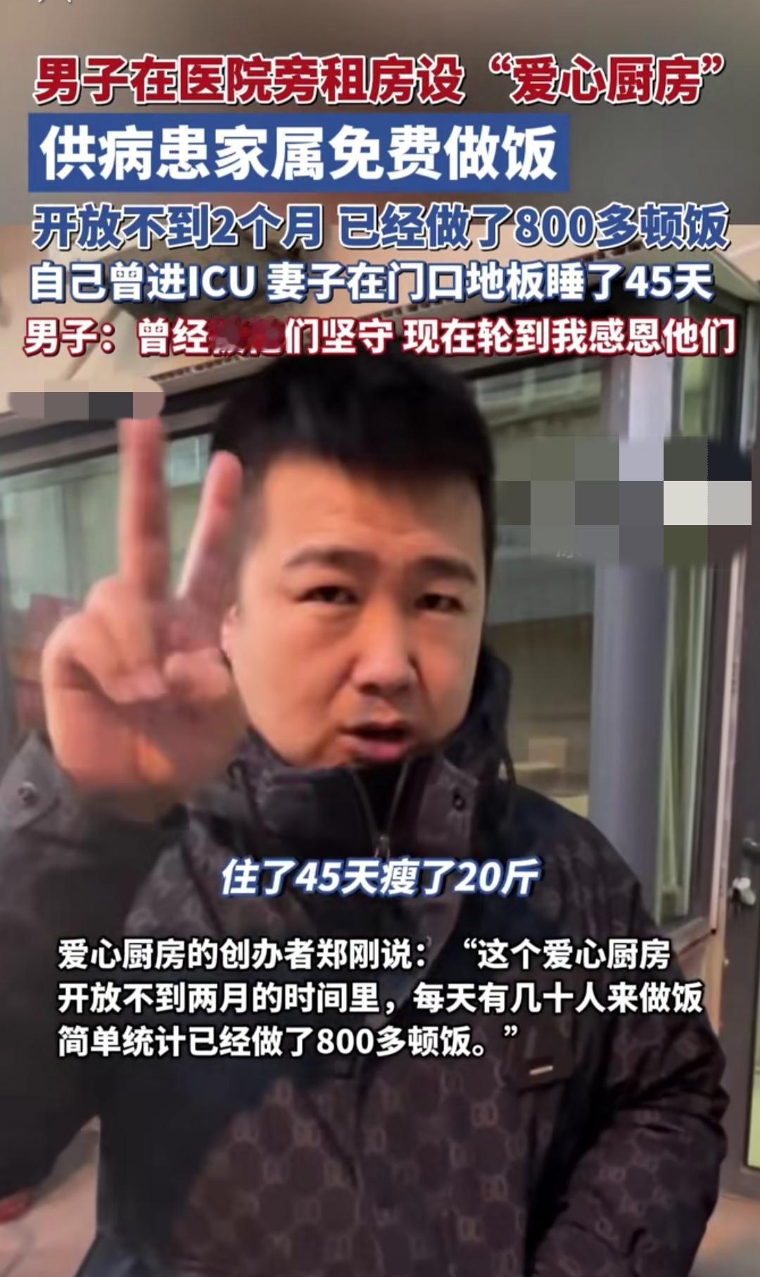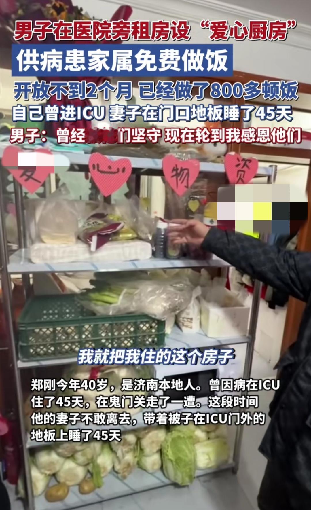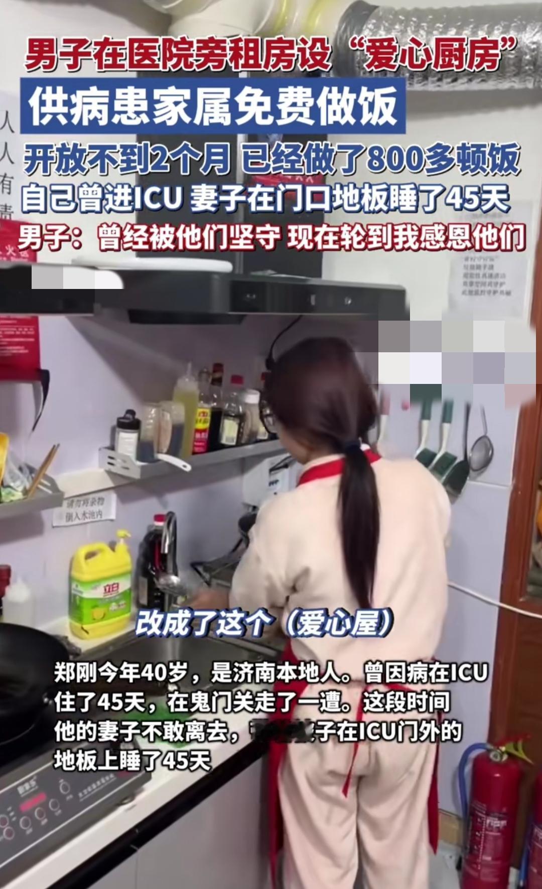 济南趵突泉小区里,那间挤在居民楼里的十平米小屋,锅铲声从早响到晚——开了不到俩月,已经让齐鲁医院的病患家属做了800多顿热乎饭。 这厨房是郑刚掏房租改的。4年前他在ICU躺了45天,妻子裹着被子在走廊地板睡了45天,瘦了20斤:“那时候想给我做口热饭都没地方”。现在这儿厨具调料全免,连白菜面条都是爱心人捐的。 烟台的宋女士天天来炒土豆丝,说“家人化疗就馋这口”;山东大叔熬着玉米粥,笑称“不喝这个浑身没劲儿”。锅碗瓢盆响里,有人红着眼说:“这口热饭,比啥安慰都顶用”。