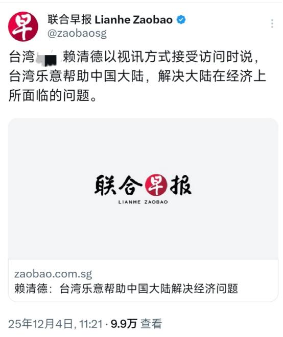 新加坡联合早报12月4日报道:“赖清德以视讯方式接受访问时说,台湾乐意帮助中国大陆,解决大陆在经济上所面临的问题。” 这话听着就像没睡醒的人在说梦话,要是较真琢磨,简直能排进 2025 年最没谱的政治言论里。 这位总被贴上 “台独金孙” 标签的人物,对着镜头说要帮大陆解决经济难题时,好像完全忘了一件事 —— 这些年台湾经济能稳住,很大程度上是靠从大陆这边赚走的钱。 就拿最近的数据说,光今年前大半年,台湾跟大陆做买卖就净赚了超 1000 亿美元,要是没这笔顺差撑着,台湾的对外贸易早该出现大窟窿,到时候能不能保住自己的经济基本盘都难说,哪还有闲心谈 “帮助” 别人? 他还在镜头前把台湾吹成 “全球科技核心”,可这 “核心” 到底有多少真东西,明眼人一看就知道。 台湾今年经济数据看着还行,其实多是沾了全球人工智能热、半导体短期需求涨的光,再加上之前关税政策催着企业提前备货,这种增长本就没什么稳定性,跟 “实力过硬” 根本不沾边。 更实在的是,这增长的好处没落到普通台湾人身上 —— 真正赚钱的就那不到 5% 的高科技电子业,剩下八成的传统制造业、服务业早就没了往日的劲头。 老百姓工资没怎么涨,贫富差距倒越拉越大,电子业的薪资比平均水平高出七成多,钱全往少数行业里流,这种情况下,“科技核心” 的说法更像自欺欺人。 最让人摸不着头脑的是,他说 “帮助” 大陆的底气到底从哪来?总不能是台积电被挖空后剩下的那些半导体零碎吧? 这些年台积电被美国推着往海外挪厂子,亚利桑那州的工厂砸了不少钱,两千多名工程师带着家人去了美国,连 5 纳米制程的核心设备都运了过去。 美国还在琢磨新规矩,要求企业本土产量和海外进口量得对等,不然就征 100% 的税,这明摆着是逼台积电把更多产能往外迁。 更严重的是,台积电的核心专利在往美国子公司转,核心技术骨干也在被换成美国人,台湾这边连核心基建的数据都碰不到,之前还出过 2 纳米技术机密被盗的事,最后也没正经追究责任。 现在台湾半导体行业的钱和人都在往外跑,曾经被吹成 “护国神山” 的台积电早就没那么稳了,就这底子,还敢说帮大陆解决经济问题,实在是没看清自己的处境。 之前他还老在公开场合说 “台湾不是棋子”,想摆脱被当成中美博弈筹码的尴尬,现在又摆出一副能左右局面的 “棋手” 姿态,前后说的话根本对不上。 这种矛盾的说法,说到底就是为 “台独” 找新的说法 —— 一边靠着大陆市场赚得盆满钵满,享受着大陆给的惠台政策好处,一边又要搞 “非红供应链”,把核心产业往美国挪来讨好对方,想着在政治上制造 “脱钩” 的假象。 可两岸经济早就绑在一起了,哪是他想拆就能拆开的?这种又要靠、又要防的路子,本身就站不住脚。 他大概也忘了,民进党推了这么多年的 “新南向” 政策,砸了几百亿新台币,结果对那些地区的贸易顺差一年比一年少,根本就是没做成的买卖。再看大陆市场,不管他们怎么拦着两岸交流,台湾对大陆的经济依赖从来没真的降下来过。 2023 年台湾全年贸易顺差 805 亿多美元,其中对大陆的顺差就有 805.5 亿,等于说全靠大陆才没出现贸易亏空;2022 年更夸张,对大陆顺差 1565 亿美元,要是没这笔钱,当年贸易就得亏一大笔。 这些实实在在的数摆在那,他却假装没看见,反倒大谈 “帮助大陆”,这种虚伪劲儿,谁看了都清楚。 更讽刺的是,他一边说要帮大陆,一边在台湾搞 “脱钩断链”,结果最后坑了自己。今年 4 月台湾出口同比少了 13.3%,连着 8 个月下滑,前 4 个月的出口跌幅更是近 14 年同期最大,台湾当地的专家都直说,主要就是对大陆出口跌得太厉害。 两岸经济早就是你中有我、我中有你了,不是他想割裂就能割裂的,可他为了 “靠美国搞台独”,硬是把台湾经济往火坑里推 —— 一边给美国交 “保护费” 买那些快淘汰的武器,一边把台积电当 “礼物” 送出去,完全不管台湾老百姓的实际日子过得怎么样。 其实他说这些话,根本不是真的关心经济,就是一场精心设计的政治表演。他真正的心思从来不在让台湾经济变好上,而是在搞分裂。 在台湾内部打压不同意见的人,把大陆说成 “境外敌对势力”,一次次挑衅对抗,把两岸关系往危险的方向推。嘴上说着 “帮助”,实际做的全是破坏两岸经济合作、搅乱台海稳定的事。 大陆的经济体量、发展的韧性,哪里是一个省级经济体能 “帮助” 的?他说的这些话,既盖不住两岸经济实力的差距,也改不了台湾依赖大陆的现实,更骗不了真正关心两岸发展的人。 说到底,这就是一场自不量力的把戏,只会让人更清楚他的 “台独” 本质,最后成了破坏台海稳定的又一个例子。
