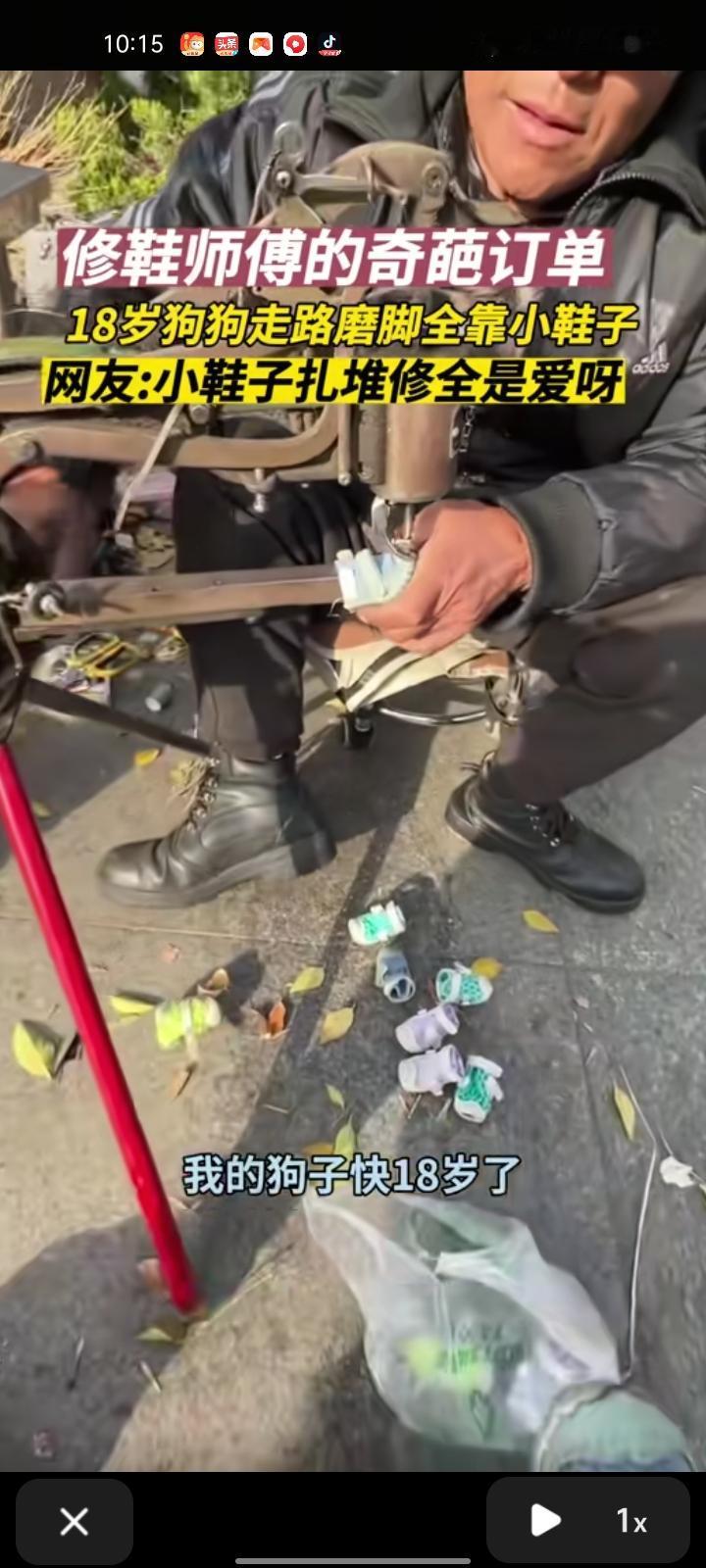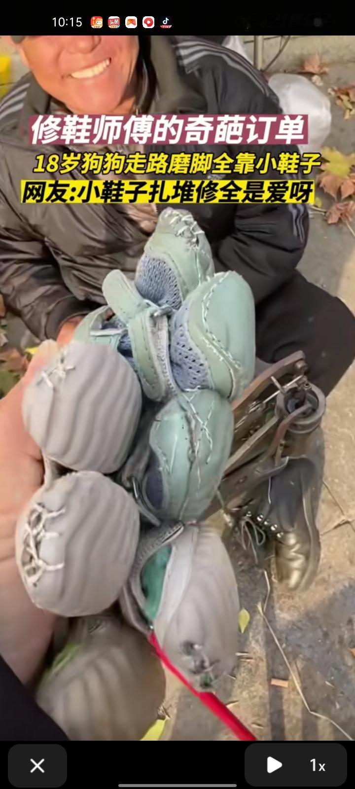 11月30日,山东济南。网友发视频称,狗狗快到18岁了,年纪较大走路不那么轻盈,走路时会磨到脚趾头,就给它买很多小鞋子。很多鞋子都坏了,就找师傅修一下,没想到师傅看到很多小鞋子哭笑不得。