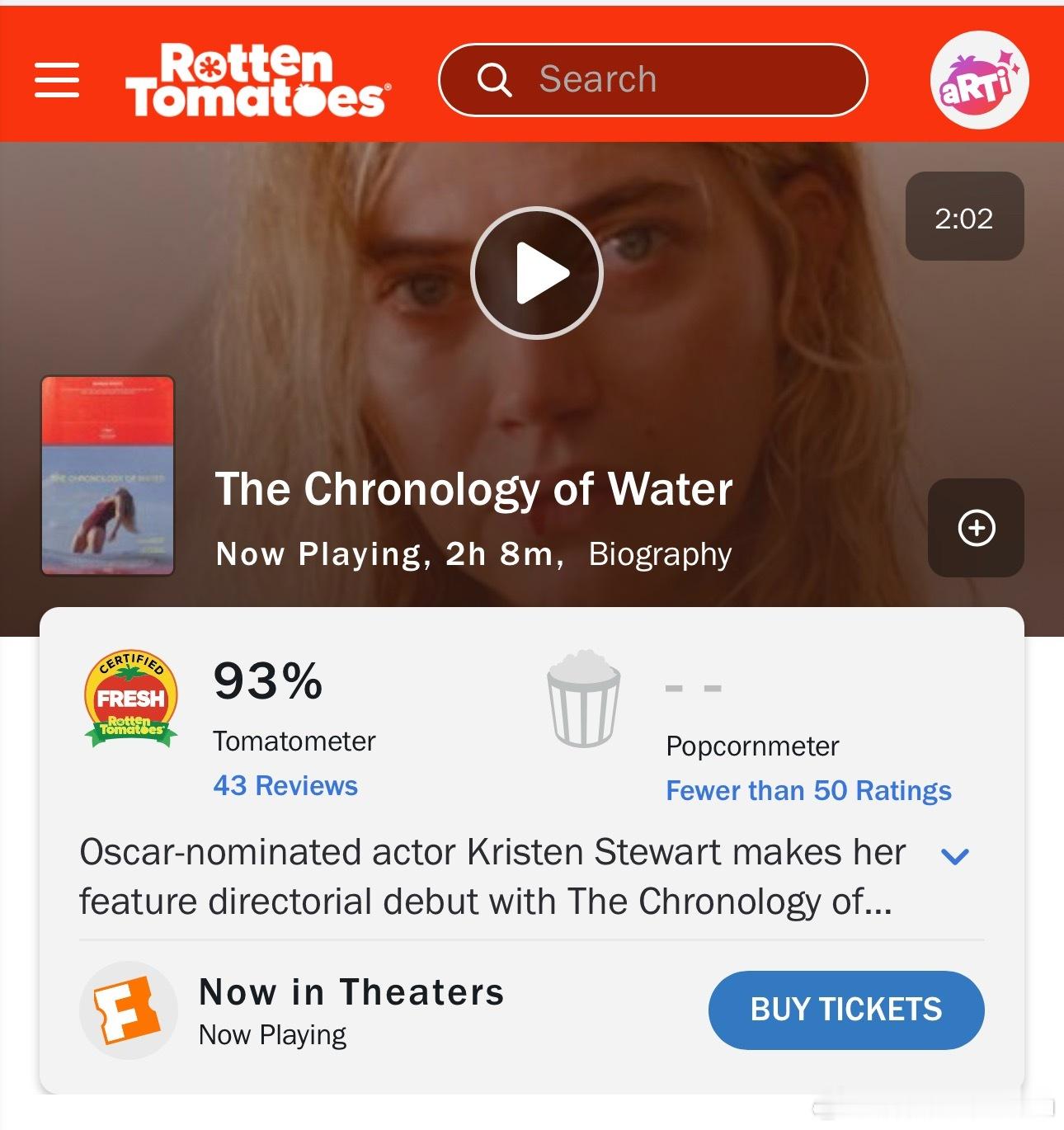 克里斯汀·斯图尔特的导演首作《水之年代》烂番茄新鲜度93%,本片目前正在北美上映