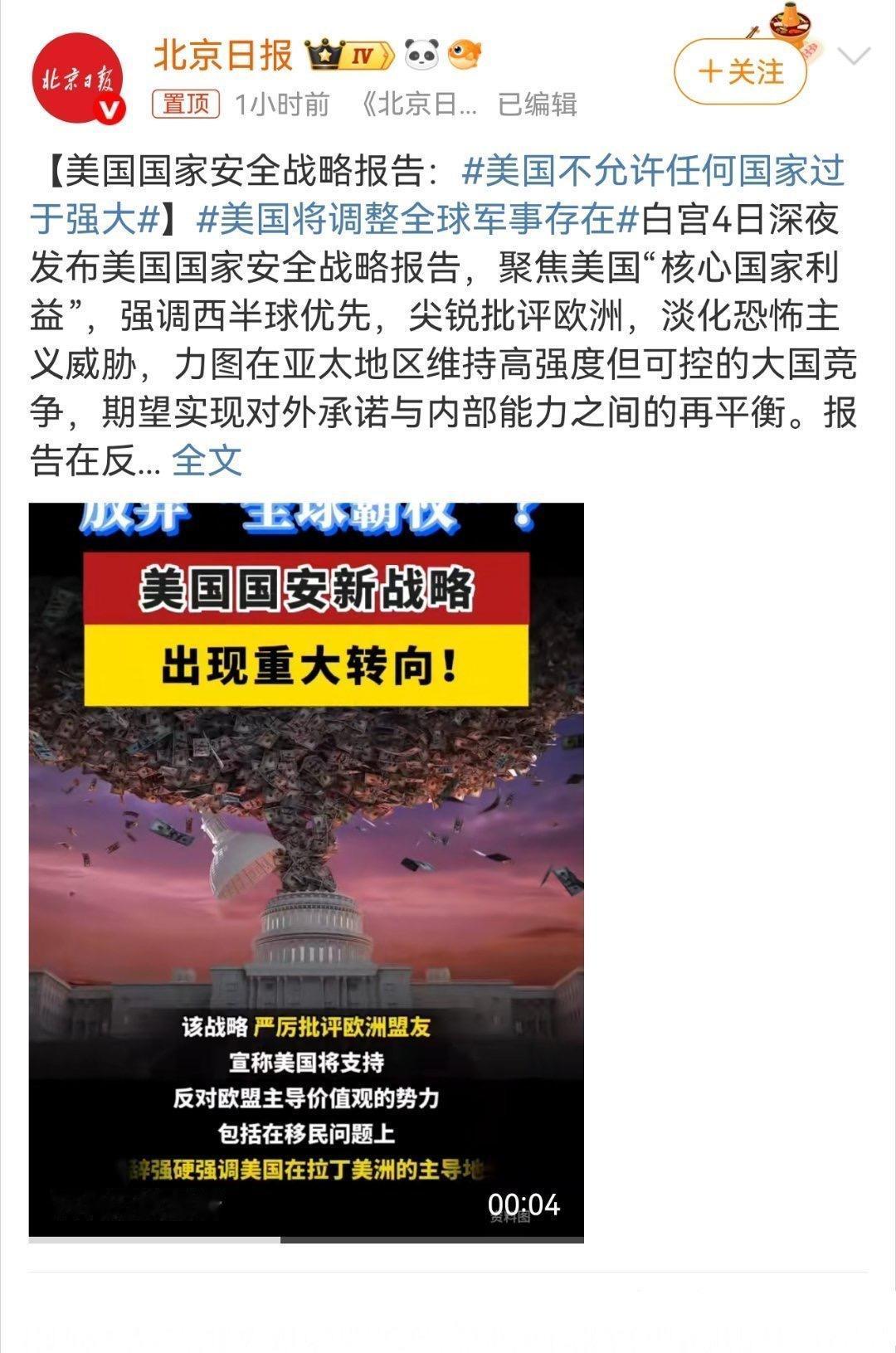 美国不允许任何国家过于强大! 白宫最新国家安全战略报告首次以"特朗普推论"升级门罗主义,赤裸宣称"美国不允许任何国家威胁其利益",引发全球对霸权逻辑的强烈反弹。 美国佬的霸权主义已经根深蒂固了。 他们会认为:凭什么你能过得好?你过好了不行,这个让你后退,让你经济倒退。 我们根本没必要太在意,他们这些流氓说了些什么。 能不能容下,是你的气度; 能不能让你容下,是我的本事。