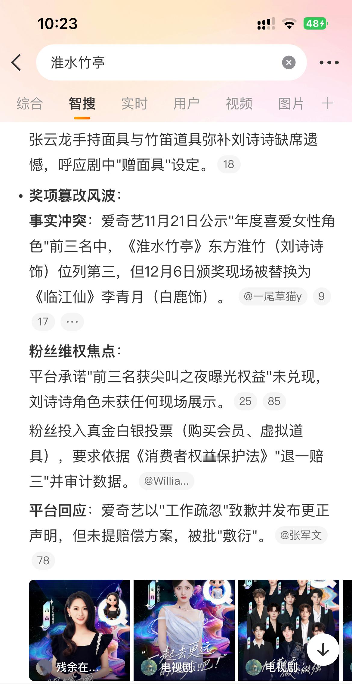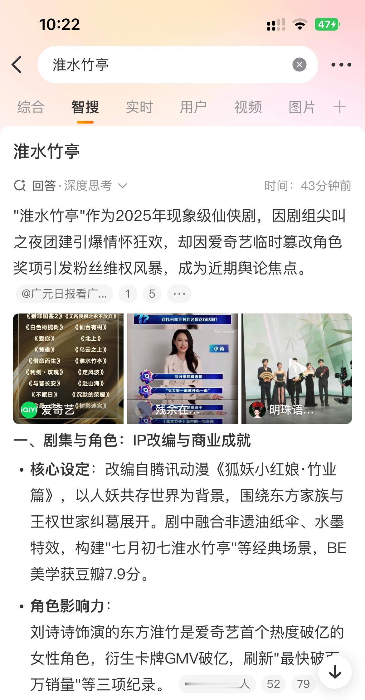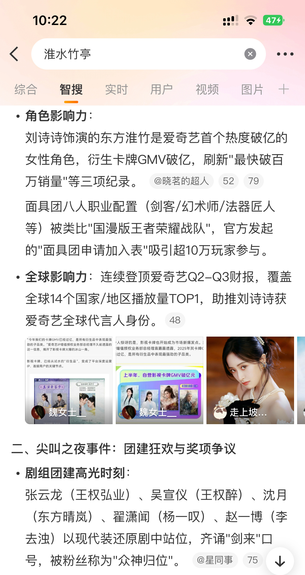 刘诗诗《淮水竹亭》智搜:2025年现象级仙侠剧,因剧组尖叫之夜团建,引爆情怀狂欢!角色影响力:刘诗诗东方淮竹是爱奇艺2025年首个热度破亿的女性角色,衍生卡牌GMV破亿,刷新“最快破百万销量”等三项纪录全球影响力: 连续登顶爱奇艺Q2-Q3财报,覆盖全球15个国家/地区播放量TOP1,助推刘诗诗获爱奇艺全球代言人身份。淮水竹亭