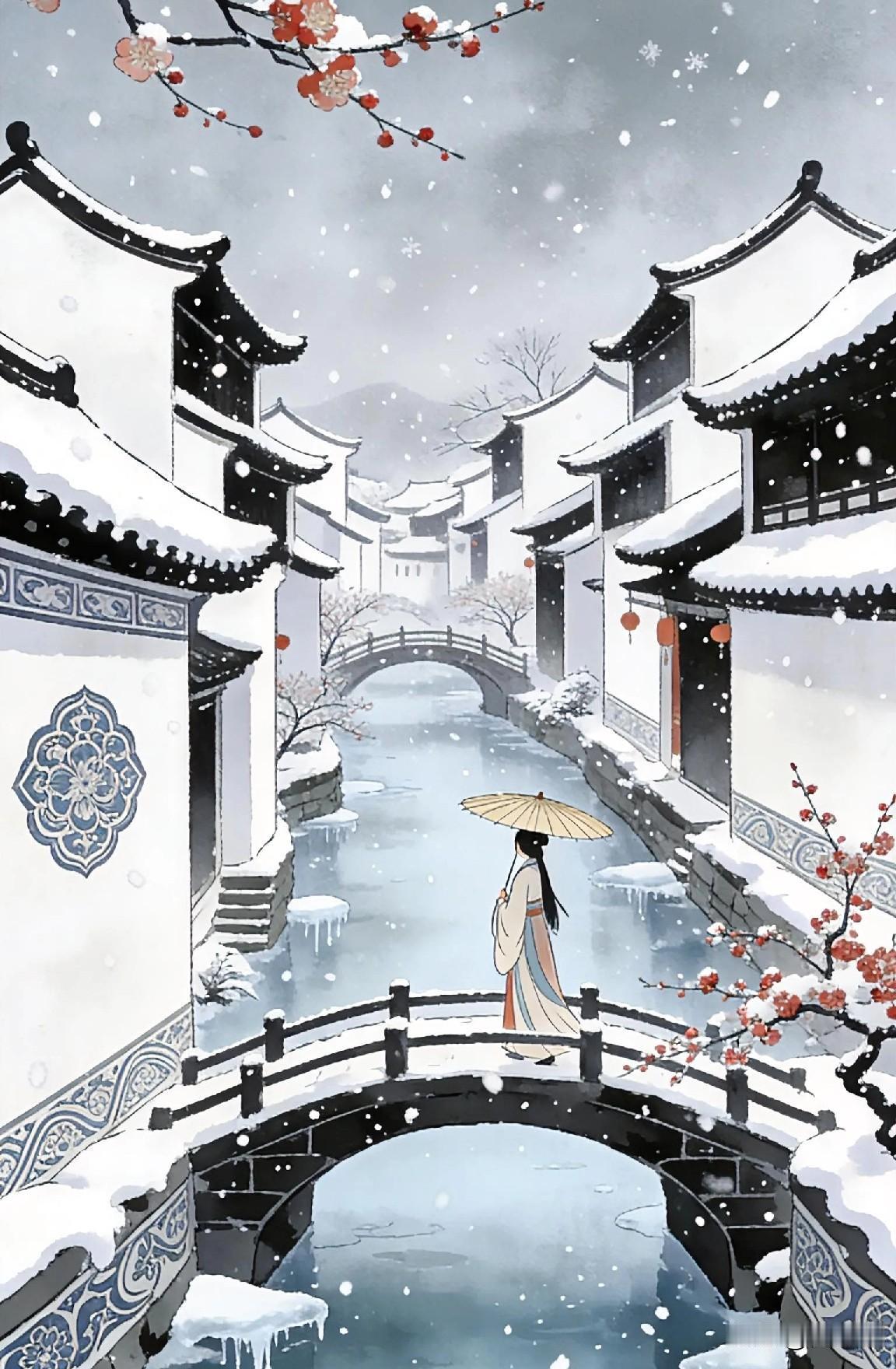 大雪至,相思长 今日大雪。 雪叠了三分,水巷浸在冷白里。 撑伞过石桥,梅香裹雪扑袖! 去年此时,你折梅插我窗瓶, 说雪是揉碎的月。 如今梅又开,桥仍是桥, 伞下只我一人。 冰棱垂水, 相思已冻成半河碎影。 你那边,雪可满阶?