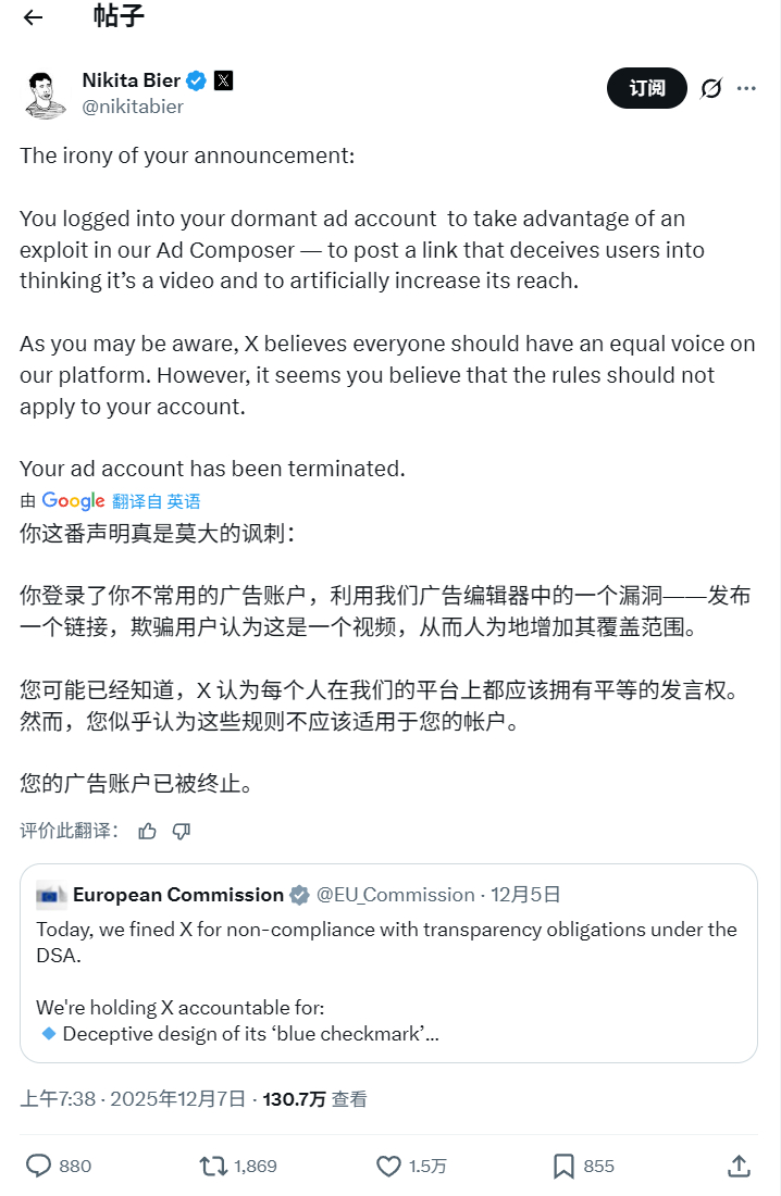 笑死,美欧之间打架也扯头花啊。欧盟根据《数据安全法》对X罚款1.2 亿欧元,还在X上发布视频官宣,X反手直接把欧盟账号的广告功能封了,理由是欧盟账号用广告系统发布了这个视频。当然,还有马斯克直接脏话转发,鲁比奥代表美国政府下场威胁报复。