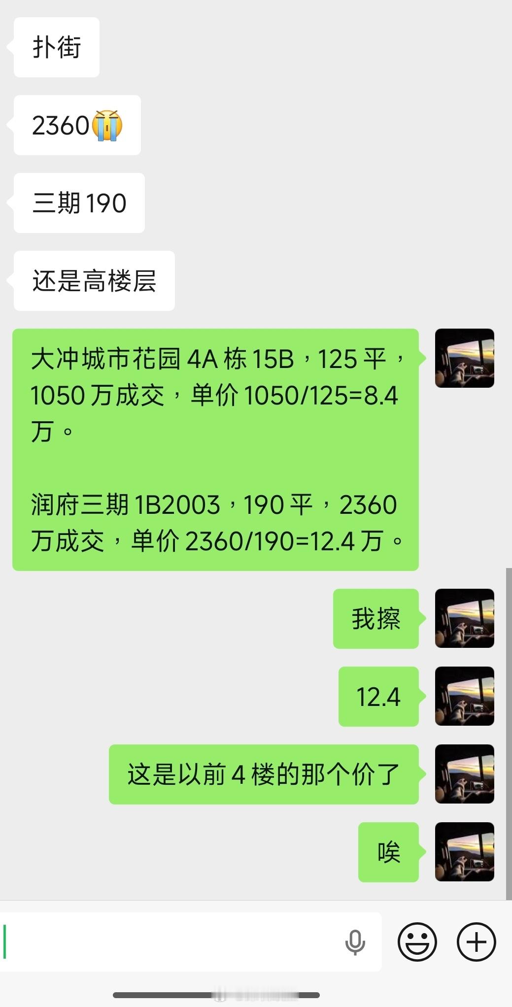 大冲城市花园4A栋15B,125平,1050万成交,单价1050/125=8.4万。润府三期1B2003,190平,2360万成交,单价2360/190=12.4万。才过去一年,深圳还需要加把劲,现在是香港在涨了。 深圳