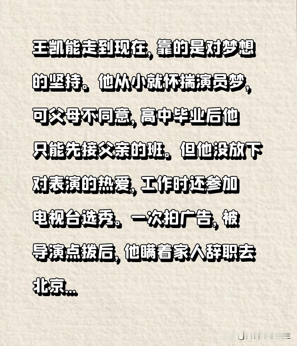 王凯能走到现在,靠的是对梦想的坚持。他从小就怀揣演员梦,可父母不同意,高中毕业后他只能先接父亲的班。但他没放下对表演的热爱,工作时还参加电视台选秀。一次拍广告,被导演点拨后,他瞒着家人辞职去北京追梦。 到北京后,他四处碰壁,后来才知道得先培训。钱很快花光,只能向父母坦白。不过他没被困难打倒,不断积累经验。后来他出演了多个经典角色,像《琅琊榜》里的靖王。正是这种对梦想的执着和多年的厚积薄发,让他从当初的小演员成为如今的实力派。 王凯谭松韵 王凯 明星 [赞][赞][赞]