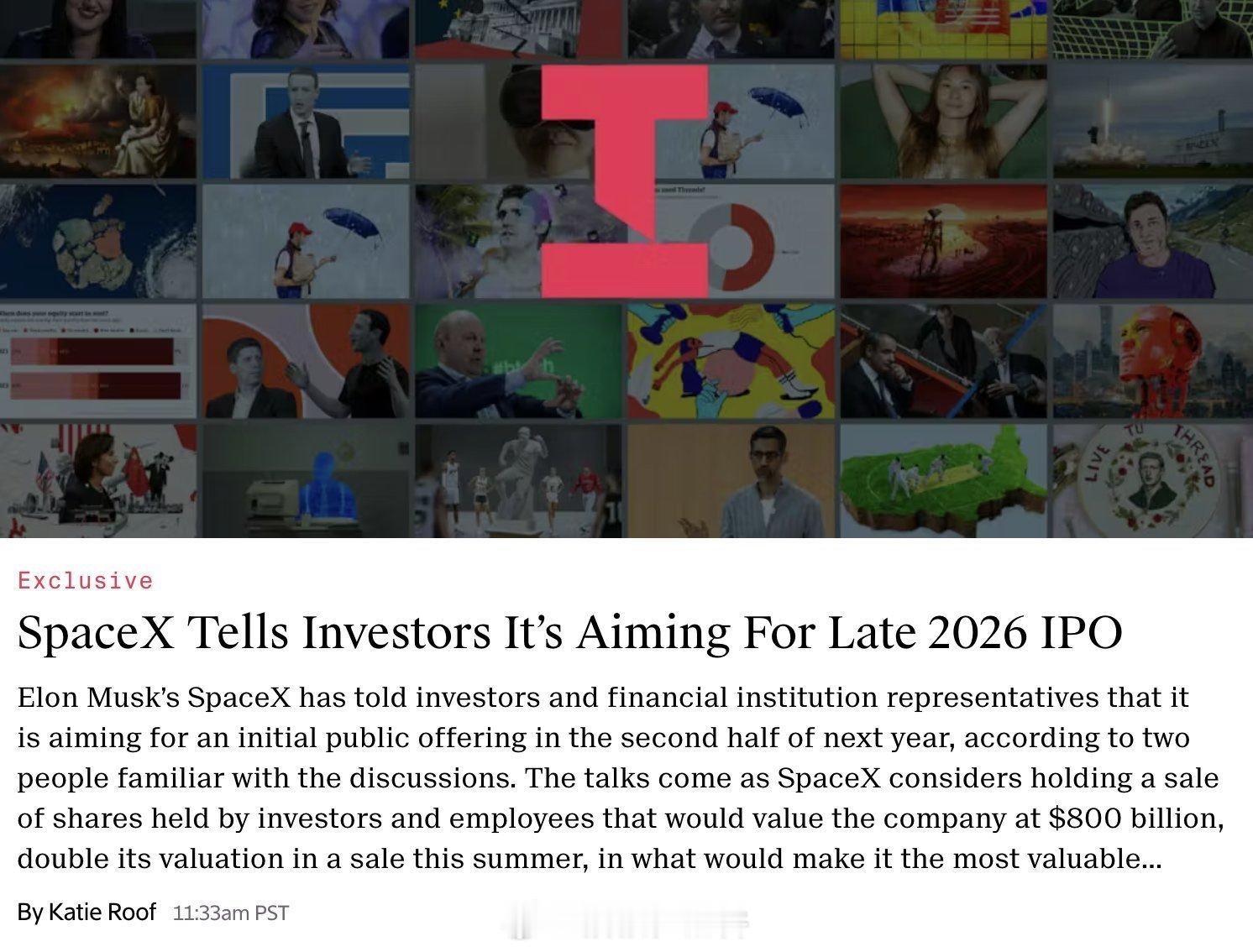 SpaceX计划明年下半年首次公开募股,他们一直是正现金流。最近一次股票内部套现的估值已经达到了8000亿美元。超过OpenAI,成为全球估值最高的创业公司。明年下半年计划上市的还有Anthroptic,或许还有OpenAI。几大超级独角兽。