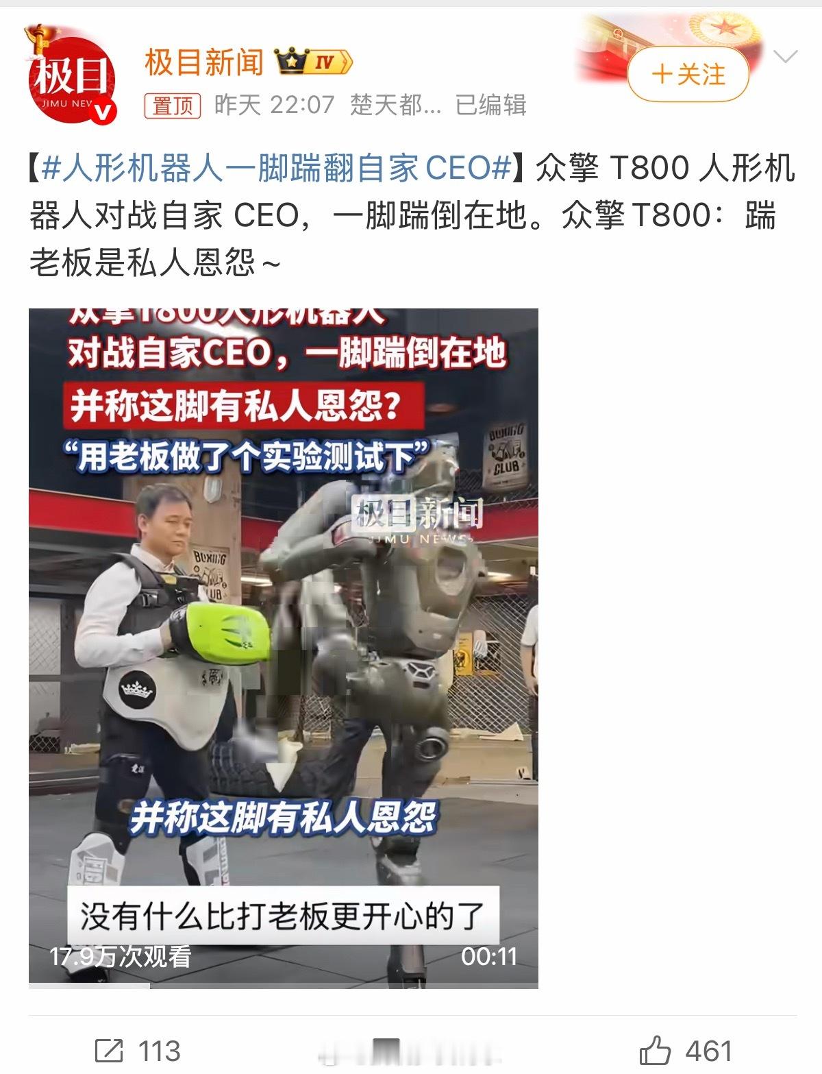 人形机器人一脚踹翻自家CEO看到实验对象是老板工程师默默的把功率调到最大👀这