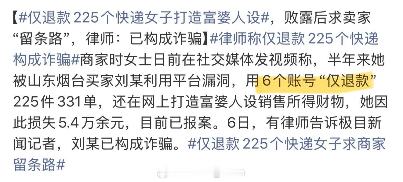 仅退款225个快递女子打造富婆人设不是???6个帐号?都用来仅退款吗?不要太离谱网络太发达真的也不太好…看到了本该看到的东西就不能踏踏实实的嘛?