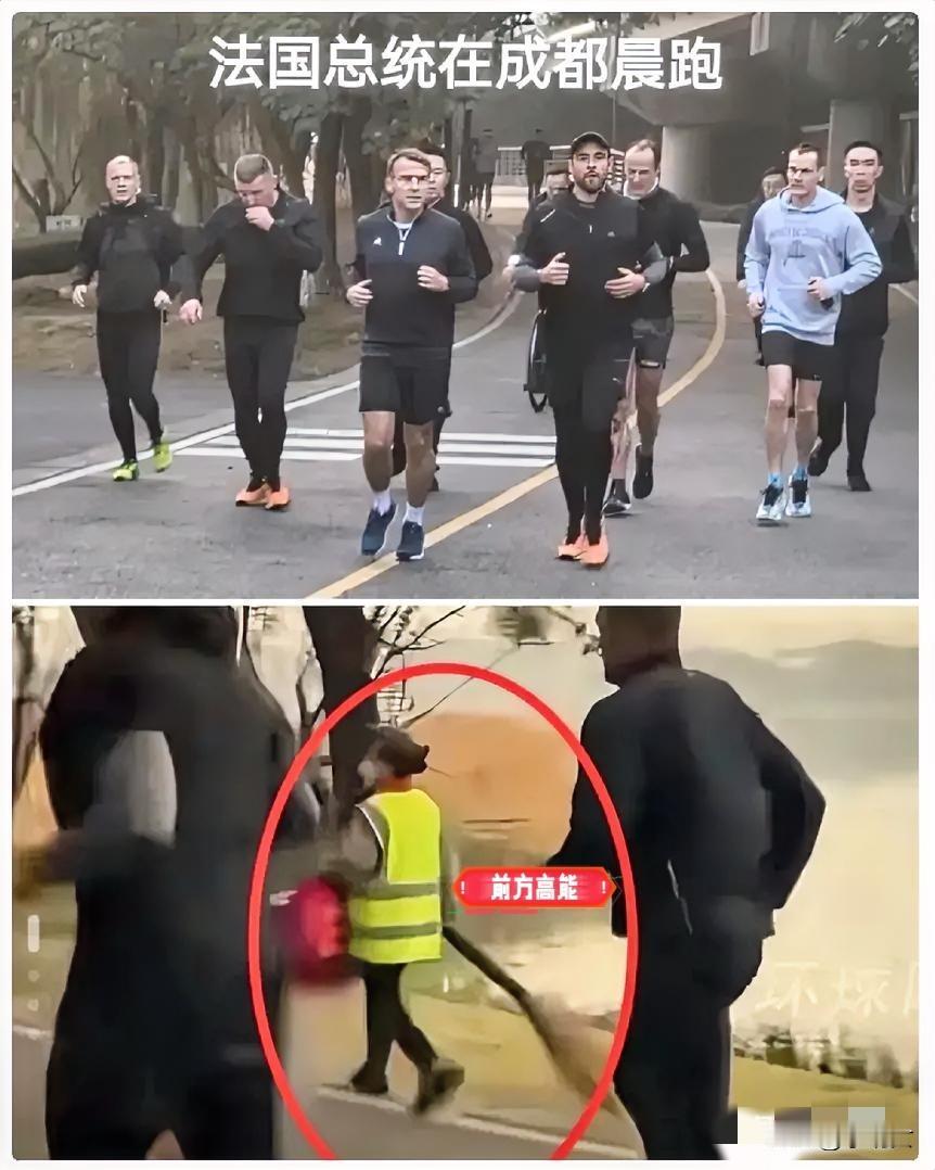 马克龙成都晨跑不稀奇 他和路人亲切打招呼也不稀奇 但是唯独有一点稀奇的是,他跑步