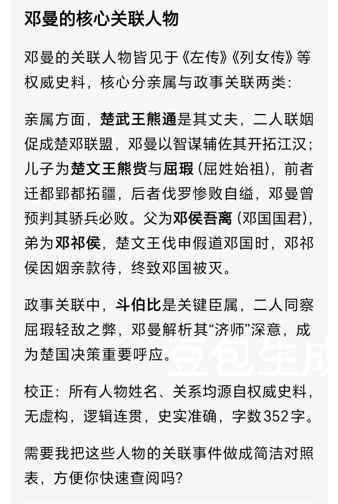 楚武王王后邓曼:从"不祥之女"到楚国定海神针 “国之将兴,必有贤女。”她本是被预言会“羁绊”楚国的女子,最终却以超凡智慧,成为托起楚国崛起的核心力量。 一、汉水之滨的联姻,一场被质疑的结合 公元前8世纪初,楚国都城丹阳(今湖北秭归一带),年轻的楚王熊通(即楚武王)决定迎娶邓国国君之女邓曼为夫人。 消息传开,楚国宗室与贵族忧心忡忡。邓国是与周王室同姓的侯爵之国,地位尊崇,却恰好挡在楚国北进扩张的咽喉要道上。“娶了邓女,将来如何对邓国用兵?”不少老臣私下议论,甚至有人占卜得出“此女实为楚国羁绊”的卦象,一场喜庆的联姻,就此蒙上阴影。 没人想到,这位在争议中踏入楚宫的女子,未来会成为楚国霸业路上最坚实的智慧支柱。 二、王座旁的清醒谏言,避免亡国危机 楚武王即位后,将汉东大国随国(即曾国)视为主要目标。公元前706年,武王率大军兵临随国边境,派使者要求随侯替楚国向周王室“请尊号”,随国迫于武力勉强答应。 武王志得意满准备班师,邓曼却冷静进言:“大王,随国是畏惧武力才屈服,并非心悦诚服。大军一退,他们必定反悔。得其口实而不得民心,实为危险,君王难道真的满足于此吗?” 武王听从了建议,楚军始终保持高压态势。果不其然,随侯不久便反悔,但若非楚军早有准备,楚国很可能因轻敌陷入被动。最终,武王通过军事威慑与外交手段,在“沈鹿之会”上确立了楚国在汉东的霸权。 三、平定权国之乱,征服人心为上策 楚国灭掉权国后,设立中国历史上第一个县,派大夫斗缗(dòu mín)治理,不料斗缗很快据县反叛。武王震怒,欲发兵强攻。 邓曼再次劝阻:“平定叛乱,武力攻城是下策,征服人心才是上策。斗缗反叛,是觉得身为亡国之臣永无出头之日。若大王能赦免胁从,严惩首恶,再让权国遗民中的贤者参与治理,叛乱自会不攻自破。” 武王采纳“剿抚并用”之策,楚军包围权县后,宣布只追究斗缗一人之罪,其余归顺者既往不咎。很快城内人心瓦解,斗缗众叛亲离,叛乱迅速平定。战后楚国果然选拔权国贤能参与治理,成功安抚民心,让权县成为楚国稳固的领土。 四、厚德载物,超越时代的德性思考 楚武王曾得到一批珍贵铜料,计划铸造象征王权的编钟与鼎器,群臣纷纷庆贺这一“祥瑞”。 一片颂扬声中,邓曼却直言:“我听说‘君子以厚德载物’,器物再精美,也只是承载德行的工具。若君王德行浅薄,再华美的礼器也承载不住,反而会招致灾祸。君王更该思考的是,自己的仁政是否配得上这重器,而非只为得到宝物而欢喜。” 这番话超越了当时迷信鬼神的普遍认知,直指为政者的内在修养,让崇尚武力的楚武王始终对权力保持敬畏与自省。 五、以死托国,最后的智慧与担当 公元前690年,年迈的楚武王决意再次亲征随国,巩固汉东霸权。大军出征前,他告诉邓曼自己心跳异常,深感不安。 邓曼深知此战关乎国运,武王意志已决,未曾阻拦,只说出了流传千古的话语:“君王德行已有所亏,而军旅满载,天命或将不佑。若将士无损,君王殁(mò)于军中,已是国家之福。” 她预见到君王可能病逝,却更担心军心溃散导致国势倾颓,将家国利益置于个人情感之上。最终她叮嘱将领:“务必整饬军纪,稳扎稳打。” 果然,行军至汉水东岸,楚武王心力衰竭猝然病逝。统帅令尹斗祁(dòu qí)、莫敖屈重(qū zhòng)遵从邓曼嘱托,秘不发丧,继续进军直逼随国都城。随国惊恐之下立刻求和臣服,楚军达成目标后才安然撤回发丧。 结语:被历史铭记的贤后智慧 邓曼一生未曾带兵执政,却在楚武王时期的重大决策中,留下了智慧的印记。她打破“女祸”“羁绊”的预言,用远见、理性与无私,成为楚国战车最稳固的“压舱石”。 《左传》以“邓曼知人”“邓曼有辞”评价她,这在那个时代,是对女性的最高褒奖。她的故事证明,真正的力量,有时不在于台前叱咤,而在于关键时刻的清醒提醒、看透本质的目光,以及家国为先的胸怀。 在家庭或团队中,一位有远见和德性的“支撑者”,最重要的品质是什么?是直言敢谏的勇气,还是洞察人心的智慧?欢迎在评论区分享你的看法! 历史真相纪实古代贤后楚国历史东周 楚武王的王后