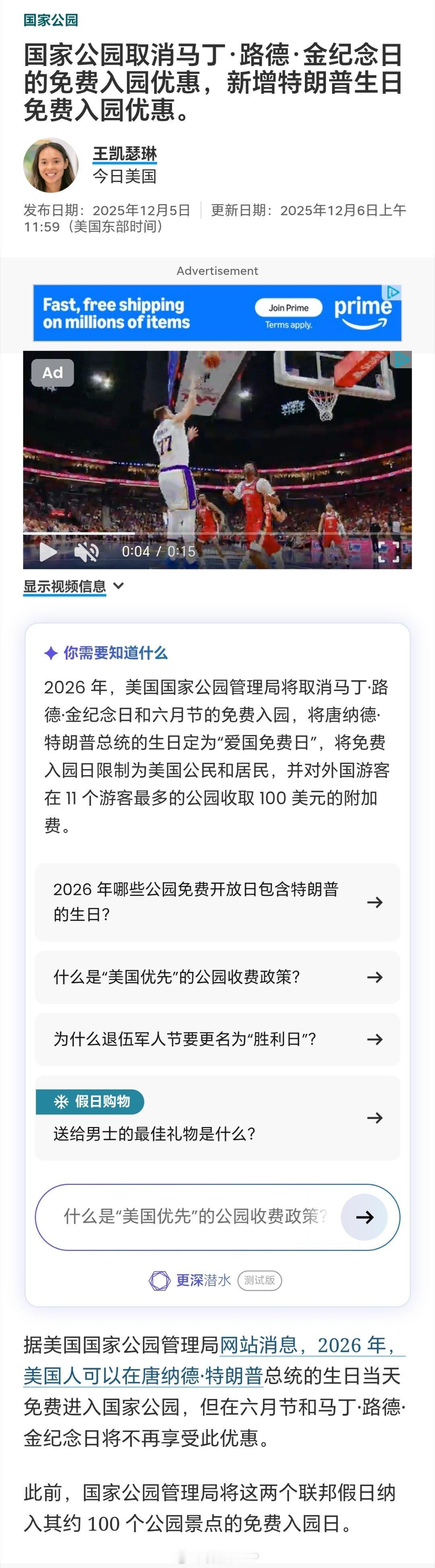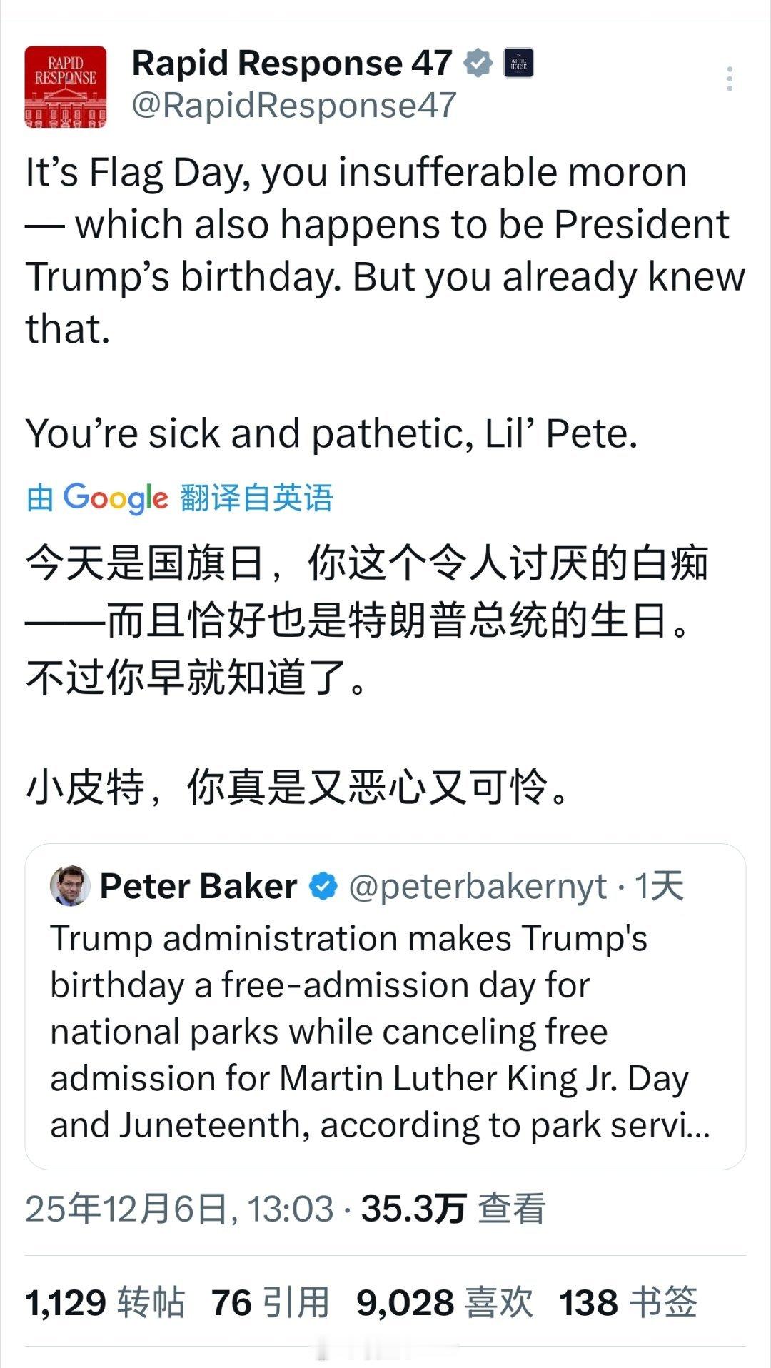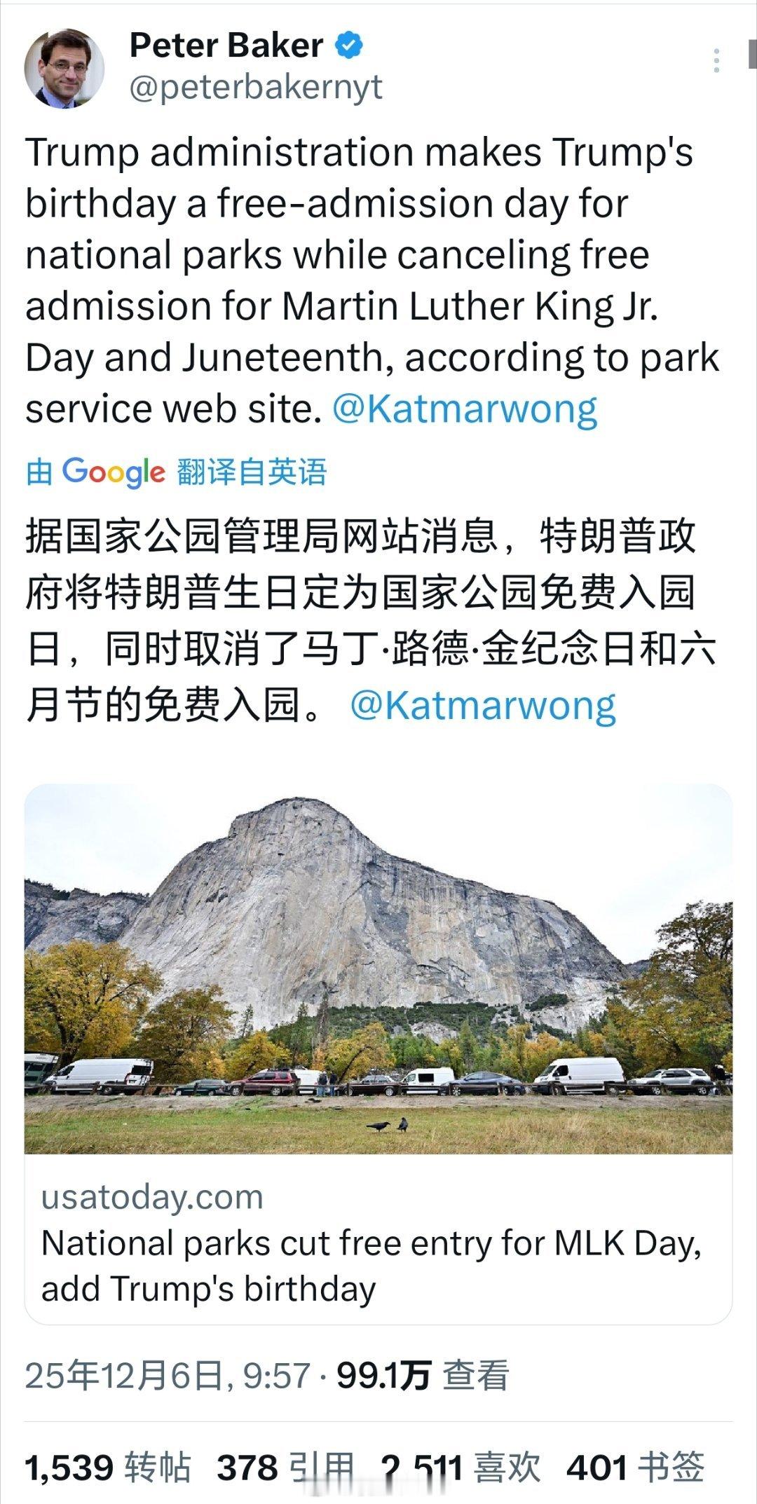 特朗普生日当天美国国家公园免门票美国国家公园管理局:解放黑奴纪念日取消免费,改为特朗普生日免费入园《纽约时报》记者彼得·贝克将此事发布在X,白宫快速反应转发开骂