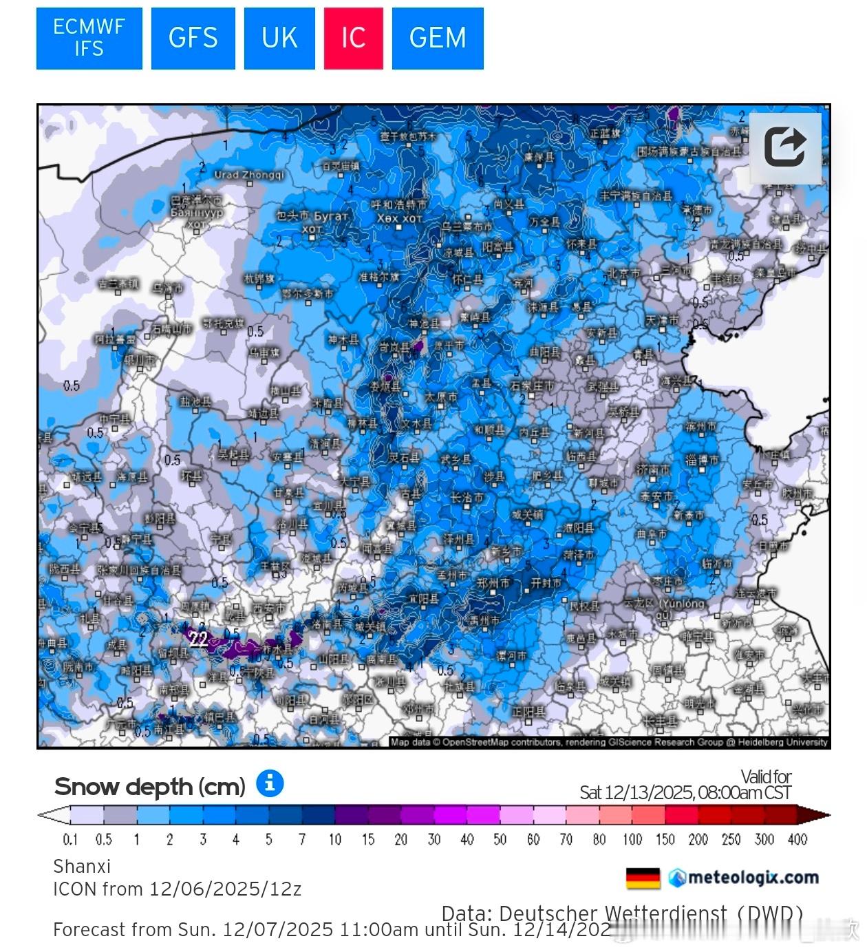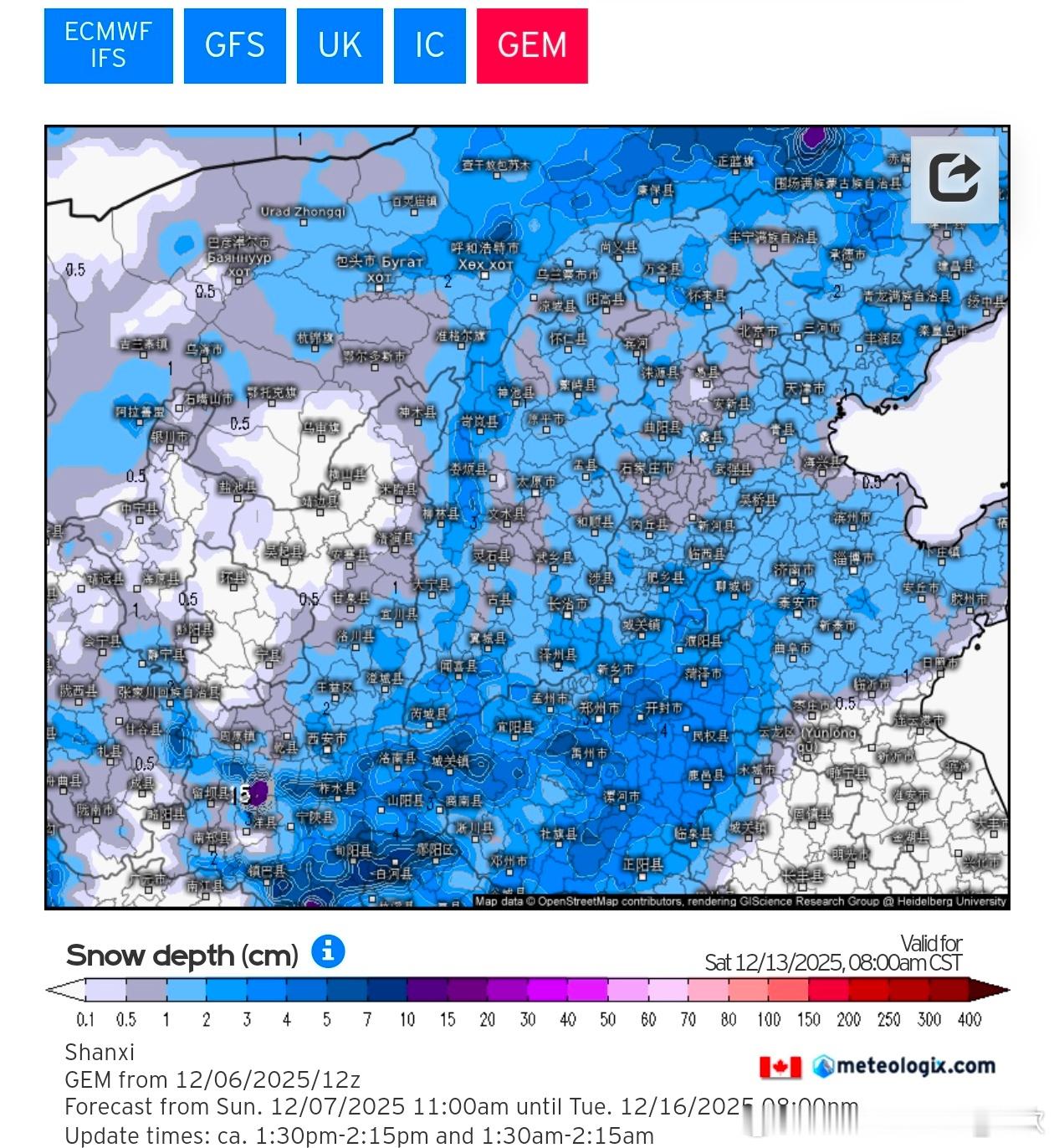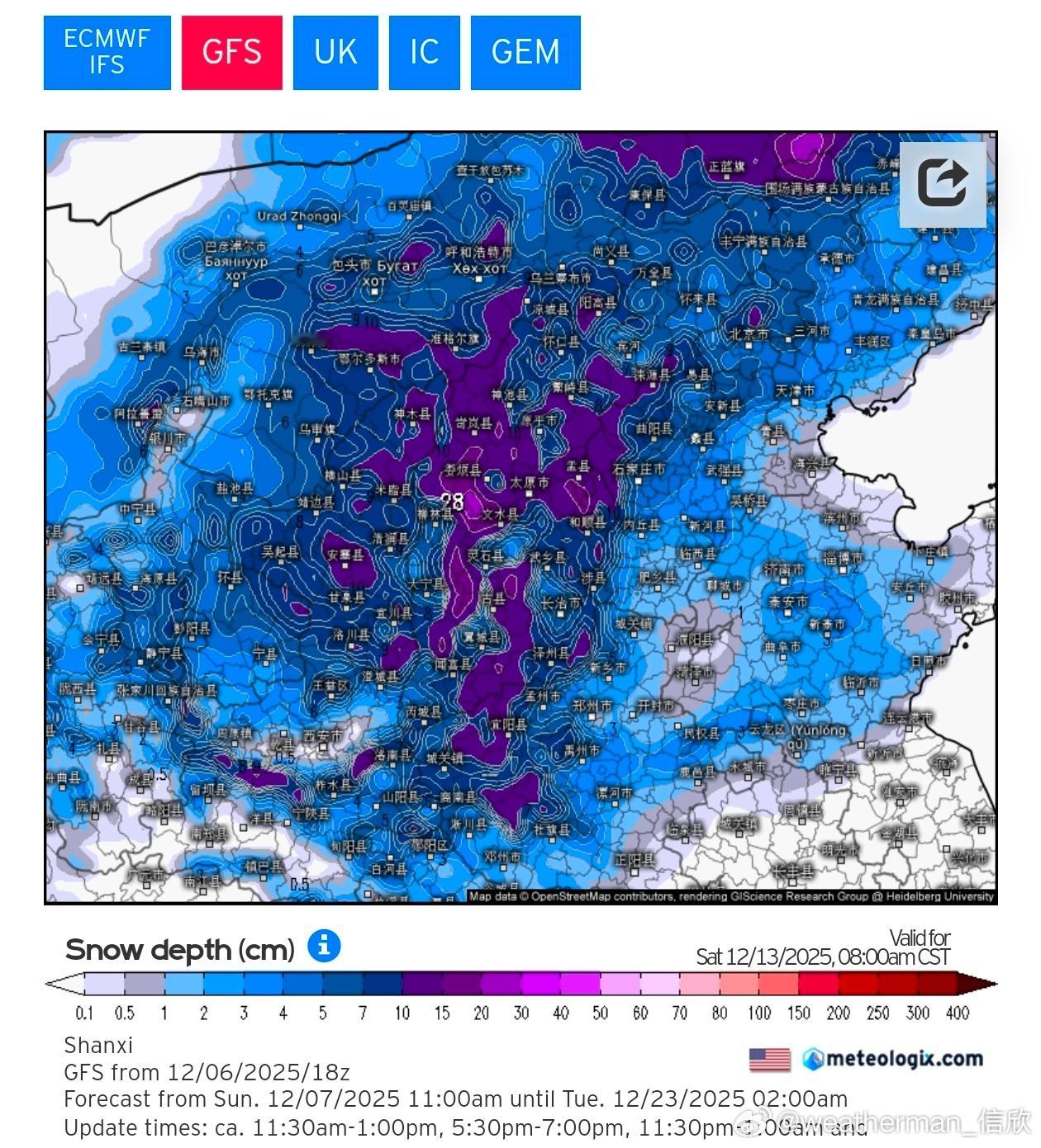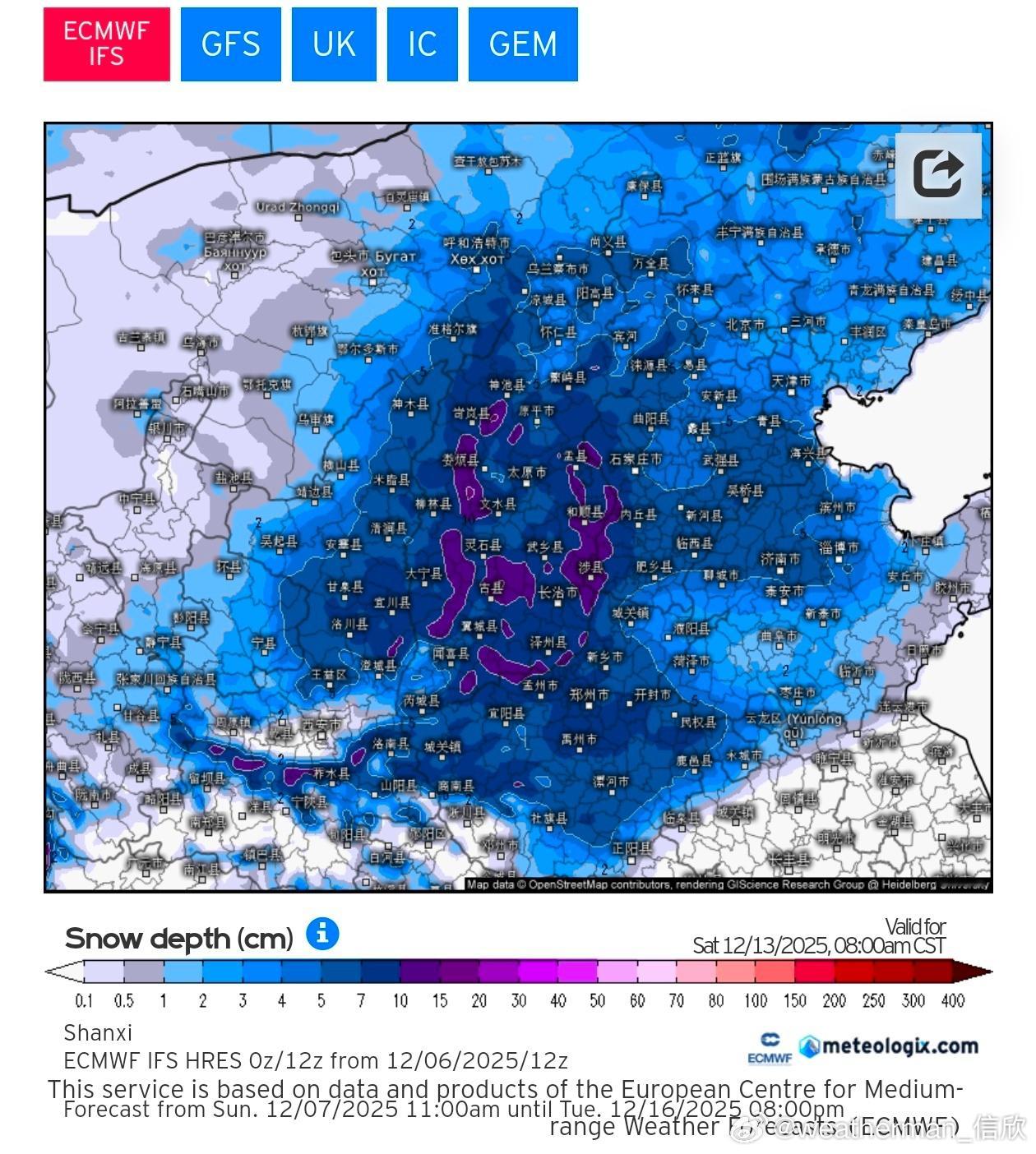 【降水】昨天到今晨,我国降水依然稀少。这样的状态会持续到11日前。9-10日新疆北部因为寒潮影响,会率先出现降雪。之后寒潮东移,冷暖空气在中东部交汇,引发大范围雨雪。华北多地有望迎来今冬初雪。趋势可信,细节待定。图6-9为欧洲、美国、德国、加拿大模式预报的13日08时积雪深度。欧美预报的积雪相对更多(后期高空槽的强度位置,地面冷高压强度位置,会影响到水汽输送,动力抬升,低空和地面温度,进而影响降雪量和积雪深度)。后期继续关注。