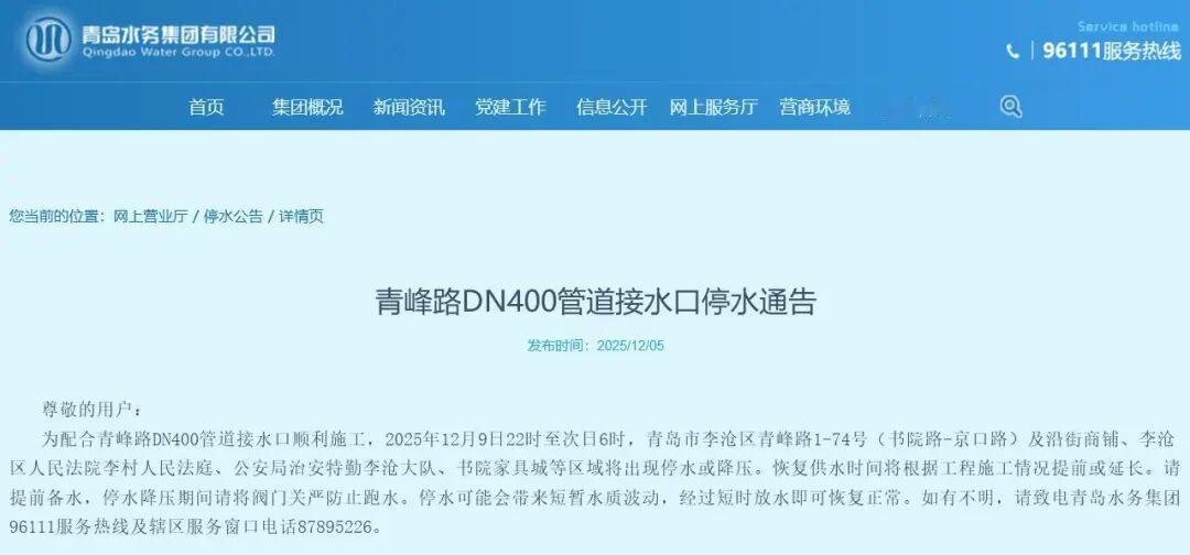 晒图笔记大赛为配合青岛市青峰路DN400管道接水口顺利施工,2025年12月9日22时至次日6时,青岛市李沧区青峰路1—74号(书院路—京口路)及沿街商铺、李沧区人民法院李村人民法庭、公安局治安特勤李沧大队、书院家具城等区域将出现停水或降压。恢复供水时间将根据工程施工情况提前或延长。请提前备水,停水降压期间请将阀门关严防止跑水。