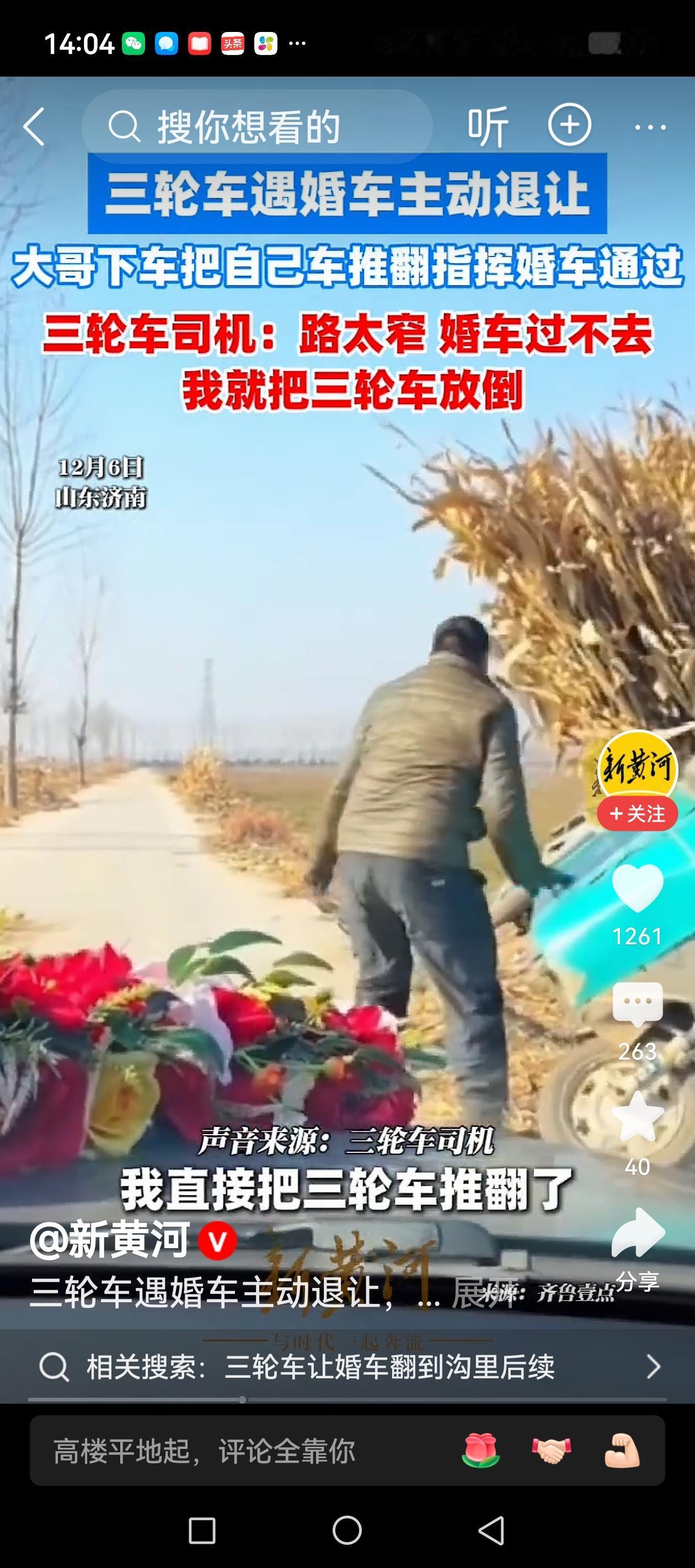 农民大哥推车礼让婚车,这格局太大了。 据@新黄河视频,12月6日,在山东济南,一位农民大哥开三轮车拉玉米秸秆时,路遇婚车,因乡路太窄,他毫不犹豫将三轮车车推倒路边让行,这一举动太暖心了,真不愧是孔子故里走出的善良之人。 这一推,推出了农民大哥对新人的尊重与祝福。婚车承载着新人的幸福,大哥以行动为这份幸福让路,是对美好情感的珍视。在快节奏的现代社会,这份质朴的善意太珍贵了。 山东作为儒家文化发源地,礼让精神深入人心。大哥虽只是普通农民,却用行动诠释了“礼”的真谛,让古老美德在新时代焕发新的光彩。 善良无关身份,文明不分城乡。农民大哥用最纯朴的方式,为我们上了生动一课。