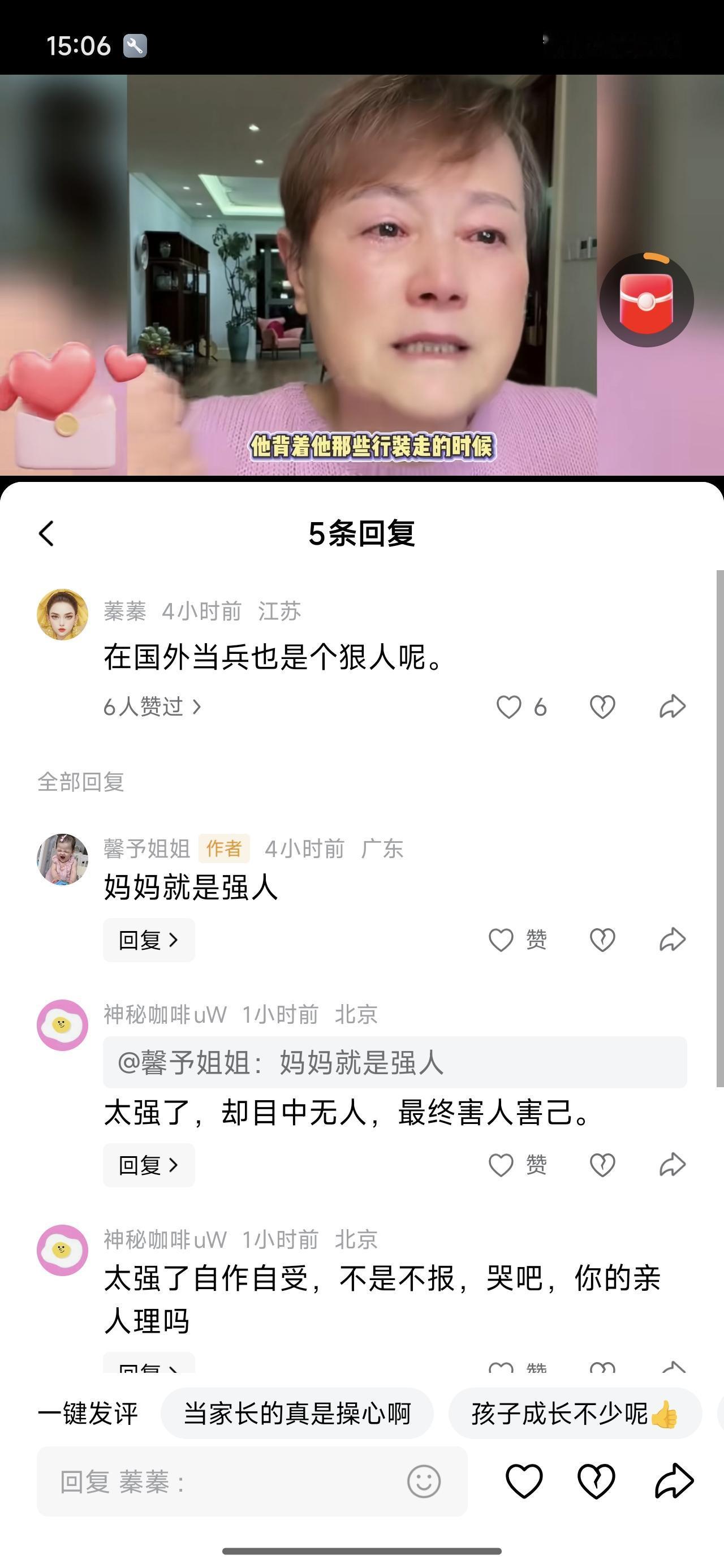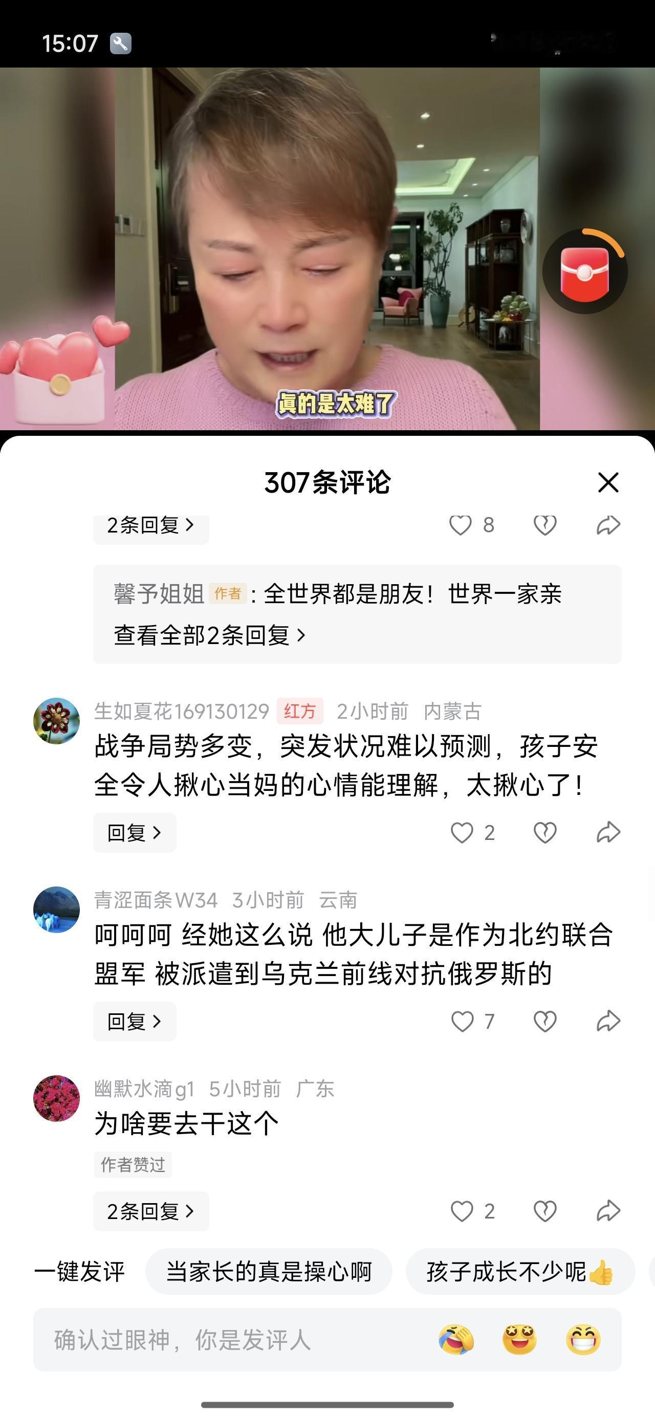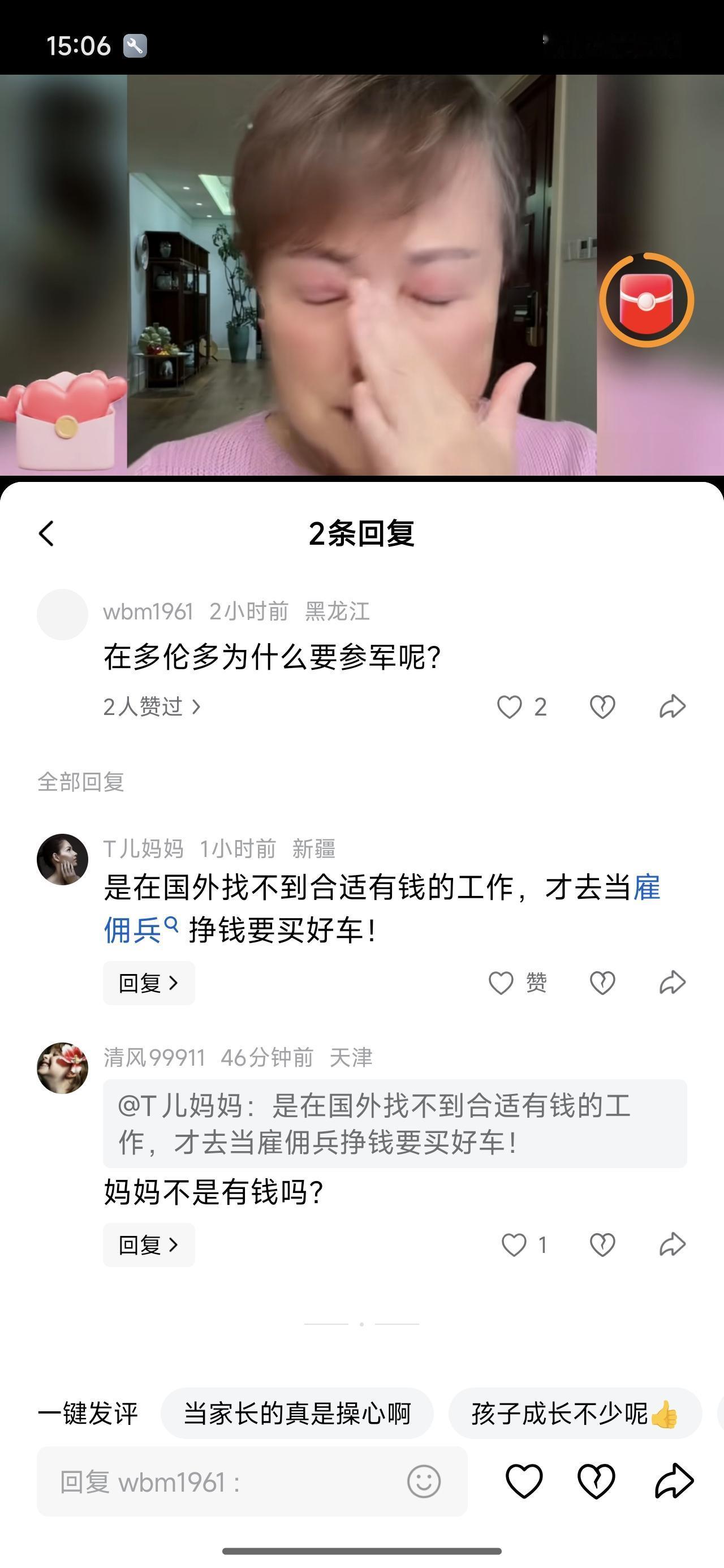 史晓燕哭成了泪人,进去一听才明白。本是中国人,父母削尖脑袋把孩子变成加拿大公民,为了去享受人家的优厚福利,现在该为自己的国家而战的时候,父母不应该哭应该是高兴之事,你不能享受在前,付出在后,对吧 她说他儿子获得了英国国王查尔斯颁的那个勋章。特别骄傲。 骄傲就好。看来是融入了那个国家。为那个国家效力,是他感到光荣的事。有评论说是去当雇佣兵。