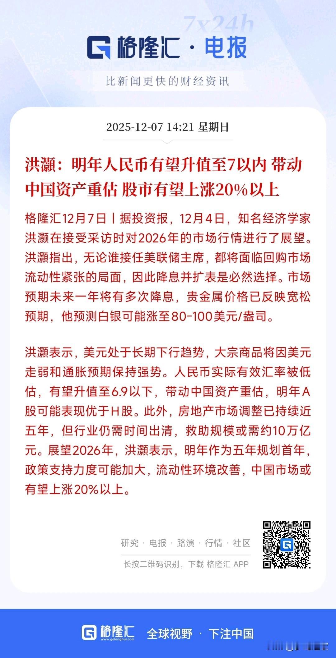 知名经济学家表示:明天中国股市有望上涨20%。 专家的预测主要是有两个原因 1.人民币升值,经济学家预测明年人民币兑美元汇率将会破7,来到6.9的大关。 人民币的升值将会带动国际热钱流向A股,带动A股市场的资产重估 2.明年可能会加大政策的力度,流动性会得到改善。 明年美联储还会进一步降息,央行也会有降息的预期,经济会得到进一步的刺激,这将带动股市新一轮的上涨。 明年能不能涨20%是未知数,但是可以肯定的是还会延续今年的慢牛行情,A股肯定还会稳步上涨。 但A股的特性就是结构性行情,只有选对板块才能赚钱,明天可能会出现新的赛道。