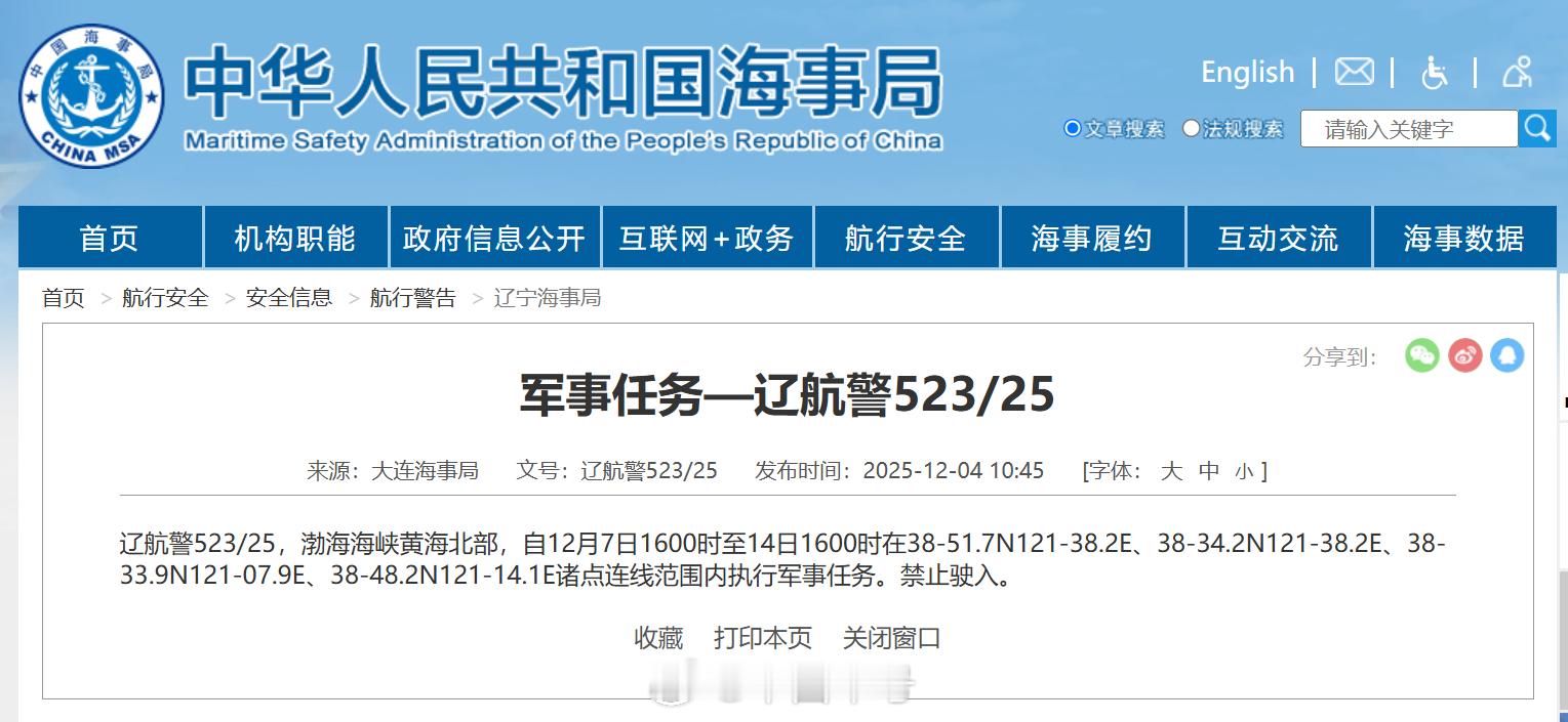 【航行警告!渤海海峡黄海北部部分海域执行军事任务】据中国海事局网站消息,大连海事局发布航行警告,12月7日16时至14日16时,渤海海峡黄海北部部分海域执行军事任务,禁止驶入。(中国海事局网站)
