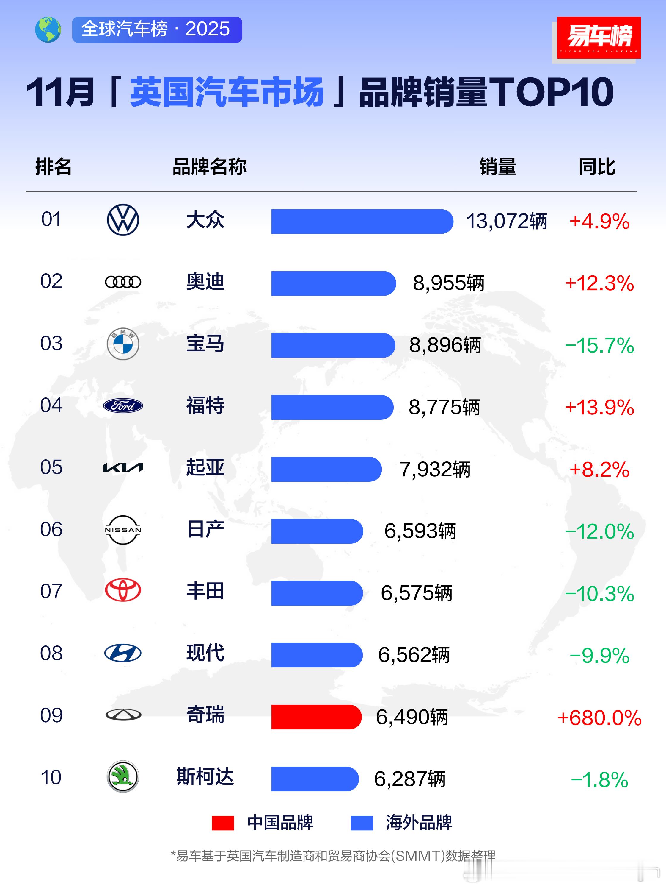 欧洲汽车市场 英国今年1-11月的销量排名,前三名分别是大众、宝马和福特。福特挤入前三英国是在英国有工厂的关系。第四和第六位都是韩国品牌,还比较意外的,丰田竟然排到了第七位。新能源汽车大V聊车汽场全开