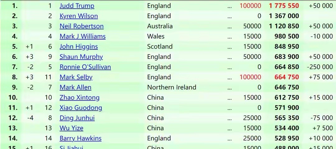 大师赛名单确定!赵心童领衔、中国5人出战,今晚抽签定签表!北京时间12月7日,2025年英锦赛来到了最后的阶段,塞尔比和特鲁姆普突破重重障碍,最终会师决赛,争夺本次的冠军。对于球员来说,英锦赛的成绩也关系着他们能否参加大师赛。虽然英锦赛之后,还有单局限时赛以及苏格兰公开赛,之后才会到1月11-8日开始的大师赛。不过,大师赛的卡点就是在英锦赛之后,所以这是球员挣扎的最后机会。在英锦赛开始之前,中国球员斯佳辉的排名是最危险的,因为他排在16位,很容易被其他球员反超,失去大师赛的资格。结果排在17位的韦克林、18位的杰克琼斯,19位的宾汉姆,以及排在20位的卡特都在英锦赛的资格赛被淘汰了,这下竞争压力骤减。当时,晋级到了正赛的球员中,只有斯莱塞、吉尔特伯、张安达、庞俊旭、周跃龙以及雷佩凡这6人还有希望,但都是夺冠才能反超斯佳辉。其实看起来斯佳辉的参赛机会有点危险,其实就是板上钉钉,这几位选手想要最终夺冠,概率基本为0。最终吉尔特伯4-6输给了威廉姆斯、雷佩凡2-6输给了塞尔比,两人双双止步首轮。随后,周跃龙2-6输给了塞尔比、斯莱塞0-6输给了霍金斯,这两位球员则是止步16强。爆冷晋级到16强的庞俊旭和张安达,在第三轮分别输给了罗伯逊和墨菲,止步8强。至此,斯佳辉的排名就稳定了,没有人能够再取得他的排名,因为晋级的选手排名都比他高。斯佳辉这边,其实本次英锦赛发挥的并不好,他在首轮6-0战胜了瑞恩戴之后,二轮以3-6的比分输给了特鲁姆普。不过,由于排在15位的加里首轮就出局了,所以斯佳辉还实现了排名的反超,现在他排在15位,加里则排在了16位。此前斯佳辉仅参加过2025年的大师赛,当时输给了艾伦,止步首轮,今年是第二次参赛,希望能够打出来好成绩。由于丁俊晖排名的下滑,现在赵心童成了中国排名最高的球员,同时他也是大师赛的2号种子选手,1号种子是卫冕冠军肖恩墨菲。赵心童和斯佳辉一样,此前只参加过一次大师赛。2022年,拿到了两个排名赛冠军的赵心童,首次出战大师赛,不过首轮2-6输给了希金斯。此后他就被禁赛了,2025年将会是他第二次参赛,不知道能够打出来什么样的成绩。肖国栋目前排在第11位,排名也反超了丁俊晖。2026年大师赛,是他征战赛场将近二十年的时间内,首次有资格参与这项赛事,希望能够打出来好成绩。排在12位的丁俊晖,是中国球员参加大师赛次数最多的一位,也曾在2011年捧起这项赛事的冠军奖杯。截止到目前,中国球员仅丁俊晖拿到过大师赛的冠军。排在13位的吴宜泽,也是首次参加大师赛,本次英锦赛他的发挥也并不算好,希望大师赛能够打的好一些。除了中国的5位球员,剩下的11位选手分别是特鲁姆普、凯伦威尔逊、尼尔罗伯逊、威廉姆斯、希金斯、奥沙利文、墨菲、塞尔比、艾伦、霍金斯以及加里威尔逊。奥沙利文接受采访的时候表示,他会尽量参加大师赛,至于会不会出战不一样。去年他就临阵退赛,没有参加大师赛。若是火箭退赛,根据排名韦克林就能获得替补的资格。大师赛的首轮是抽签决定的,而抽签的时间是在英锦赛上半场的中场休息时间段,所以今天晚上大师赛的对阵签表就会出炉。