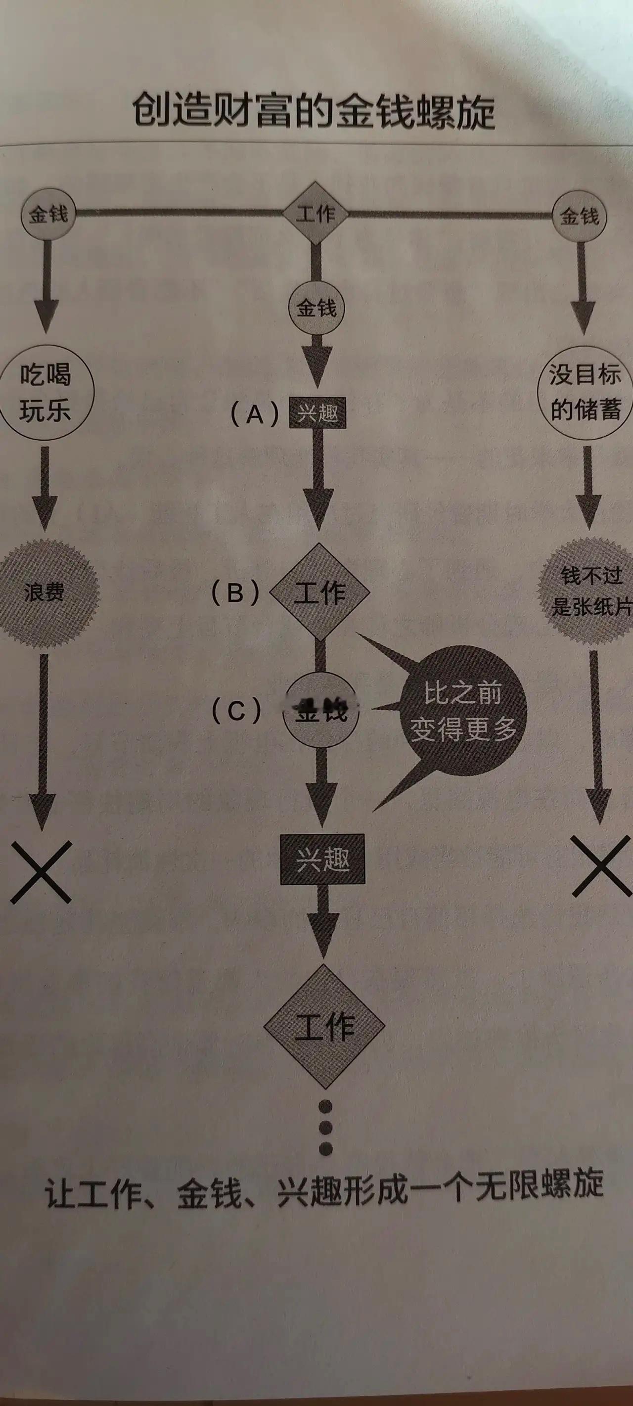 创造财富要懂得金钱螺旋 如果没有目标的储蓄,就只能成为守财奴,失去人生的意义和乐趣;如果赚钱后只知道吃喝玩乐,就会坐吃山空;只有懂得合理使用金钱,钱才会越花越多。 不但股市中的K线是曲折螺旋的,而且金钱也会通过螺旋效应,让花掉的钱自己流回来。 首先,我们要选择自己喜欢的事情,把钱集中投入到这个地方,借此磨炼谋生的技能和赚钱的能力。然后做到别人难以做到的事。 如想在九亏一赚的股市中胜出,至少应该把股市的规则看懂、摸透,千万不要什么都不懂就仓促入市。 经常有股友问我炒股看什么书好,我认为凡是书店中能看到书籍,都可以翻一遍。特别是要反复阅读那些已经成功人写的文字,如:格雷厄姆、巴菲特、芒格、马克斯、邓普顿……看书最大的好处是,前人用一生的时间总结出来宝贵经验,可以让我们在几个小时内学到。 我认为只要有兴趣,就不难赚到钱。赚到钱以后,又可以用到自己的兴趣上。最后,把金钱→兴趣→工作→金钱……螺旋起来。