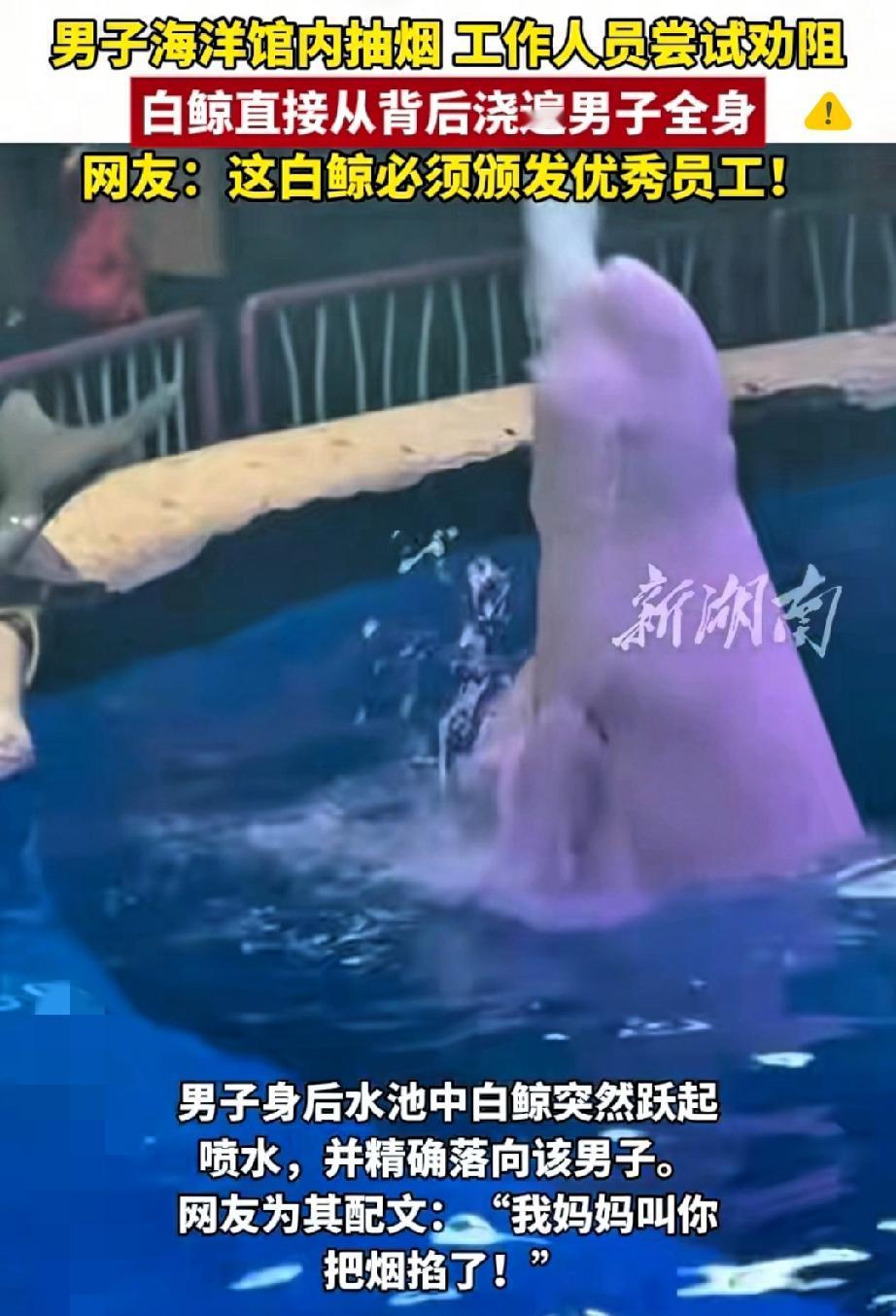 笑不活了!人类不听劝的吸烟行为,居然要靠白鲸来“硬核纠正”! 海洋馆里工作人员明确劝阻,男子还偏要猛吸一口,结果下一秒就被身后游来的白鲸精准喷水,烟头直接熄灭。 这波操作真不是剧本! 要知道白鲸智商相当于3-6岁小孩,能主动互动还懂观察,这一喷水看似巧合,实则是高智商生物对“不文明行为”的本能排斥。 现在多地都明确室内公共场所禁烟,违者最高可罚500元,遵守规矩本是基本素养,哪还用得着动物来“出手”。 公共空间的文明从来不是小事,既关乎他人健康也体现自身修养。 你觉得这只白鲸该颁个“最佳禁烟监督员”奖状吗?如果遇到公共场所吸烟的情况,你会选择上前劝阻吗?