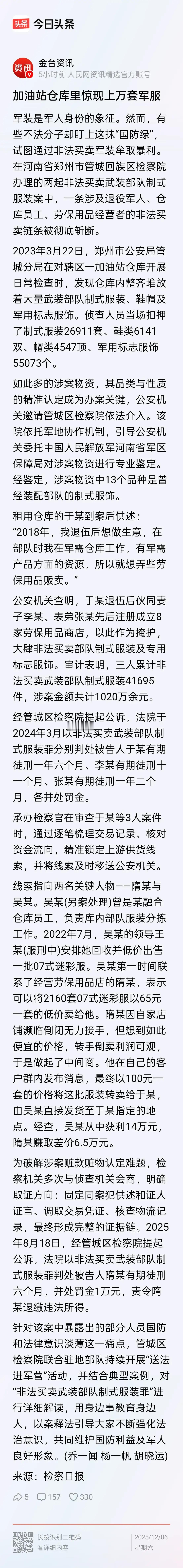 军队里的蛀虫比敌人还可怕!河南查获的特大军装贩卖案,光制式服装就扣了2万多套,军用标志5万多个,这数量看得人脊背发凉。 2万多套制式服装是什么概念?足够装备一个满编旅,5万多个军用标志更是能让无数身份不明的人摇身变成“军人”。这些本应守护家国的特殊装备,却被不法分子当成牟利工具,背后牵扯出的利益链条和监管漏洞,比案件本身更让人忧心。核心论点很明确:军装不是普通商品,它承载着军队的荣誉、国家的安全,贩卖军装就是触碰国家安全的红线,必须零容忍。 军装的特殊性在于它的“身份属性”。穿上军装,就意味着被赋予了军人的象征意义,普通人看到军装会本能地产生信任,甚至服从。想象一下,如果这些非法流入市场的军装被别有用心的人利用,冒充军人招摇撞骗、实施犯罪,不仅会损害军队的形象,还可能引发社会秩序混乱。更严重的是,一旦军用标志落入敌对势力手中,可能被用于刺探军情、制造混乱,给国家安全带来无法估量的风险。 这起案件绝不是孤立的个例,背后一定有一条完整的黑色产业链。从军装的生产、运输到销售,每个环节都需要有人“打通关节”。正规的军用物资管理有严格的流程,从生产厂家到部队仓库,每一步都有登记备案,这些2万多套制式服装能成功流出,说明监管环节出现了严重漏洞。要么是生产企业违规超额生产、私下售卖,要么是仓库管理人员监守自盗,要么是运输途中被人掉包,无论哪种情况,都意味着有“内鬼”在为非法交易提供便利。 这些“内鬼”就是军队和国家的蛀虫。他们拿着国家的俸禄,却干着损害国家安全的勾当,把军人的荣誉、国家的安全当成牟取暴利的筹码。军人在前线保家卫国、流血牺牲,他们在后方监守自盗、中饱私囊,这种行为比敌人的枪炮更具破坏性。敌人的攻击我们能看得见、防得住,而这些隐藏在内部的蛀虫,却在悄无声息地侵蚀着军队的根基,瓦解着国家的安全防线。 更让人愤怒的是,非法贩卖军装的利润空间巨大,一些不法分子为了赚钱铤而走险,甚至不惜铤而走险生产劣质军装。这些劣质军装看似和正规军装别无二致,却可能在关键时刻无法发挥防护作用,如果流入部队,后果不堪设想。军人在训练、执行任务时,军装是他们的“第二层皮肤”,质量不过关的军装可能会让战士们面临生命危险,这不是简单的违法犯罪,而是对军人生命的漠视,对国家安全的践踏。 案件的侦破让人拍手称快,但更重要的是堵住监管漏洞。要知道,军装贩卖案的发生,根源在于部分单位对军用物资的管理松懈。一些单位没有严格执行军用物资登记、保管、销毁制度,让不法分子有了可乘之机。想要杜绝此类案件再次发生,就必须加强对军用物资全流程的监管,从生产源头到部队使用,每个环节都要责任到人、层层把关,让不法分子无缝可钻 军队是国家的钢铁长城,军装是军人的荣誉象征,容不得任何亵渎和践踏。这起河南特大军装贩卖案,给我们敲响了警钟:国家安全无小事,任何监管漏洞都可能成为敌人可乘之机,任何内部蛀虫都可能给国家带来致命伤害。守护国家安全,不仅需要军人在前线浴血奋战,更需要堵住后方的漏洞,清除内部的蛀虫,只有这样,我们的钢铁长城才能坚不可摧。 各位读者你们怎么看?欢迎在评论区讨论。军装标识 军装回收 假冒军装 军事服装知识 迷彩服装批发 特种衣服