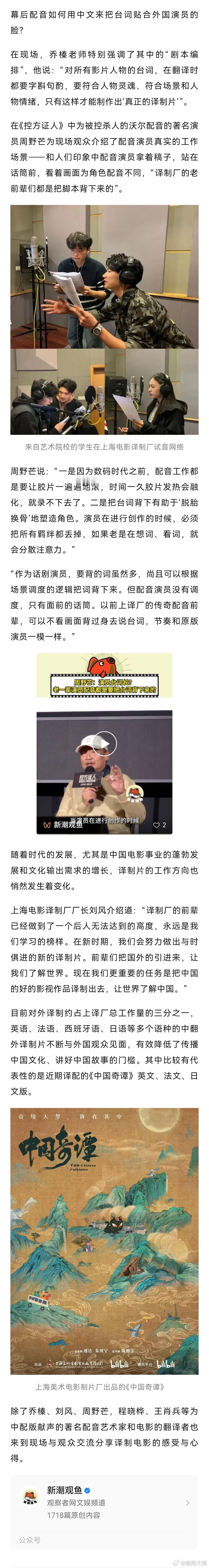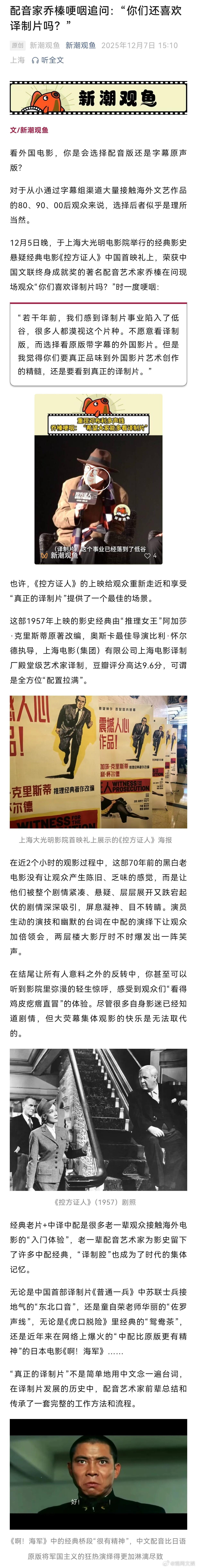 【殿堂级中配+影史神作,配音家乔榛哽咽追问:“你们还喜欢译制片吗?”】中配控方证人使观众重新品味译制片12月5日晚,于上海大光明电影院举行的经典影史悬疑经典电影《控方证人》中国首映礼上,荣获中国文联终身成就奖的著名配音艺术家乔榛哽咽提到,“要真正品味到外国影片艺术创作的精髓,还是要看到真正的译制片。”乔榛哽咽喊话希望大家能多看译制片也许,电影控方证人的上映给观众重新走近和享受“真正的译制片”提供了一个最佳的场景。这部1957年上映的影史经典由“推理女王”阿加莎·克里斯蒂原著改编,奥斯卡最佳导演比利·怀尔德执导,上海电影(集团)有限公司上海电影译制厂殿堂级艺术家译制,豆瓣评分高达9.6分,可谓是全方位“配置拉满”。在近2个小时的观影过程中,这部70年前的黑白老电影没有让观众产生陈旧、乏味的感觉,而是让他们被整个剧情紧凑、悬疑、层层展开又跌宕起伏的剧情深深吸引,屏息凝神、目不转睛。演员生动的演技和幽默的台词在中配的演绎下让观众加倍领会,两层楼大影厅时不时爆发出一阵笑声。在结尾让所有人意料之外的反转中,你甚至可以听到影院里弥漫的轻生惊呼,感受到观众们“看得鸡皮疙瘩直冒”的体验。尽管很多自身影迷已经知道剧情,但大荧幕集体观影的快乐是无法取代的。