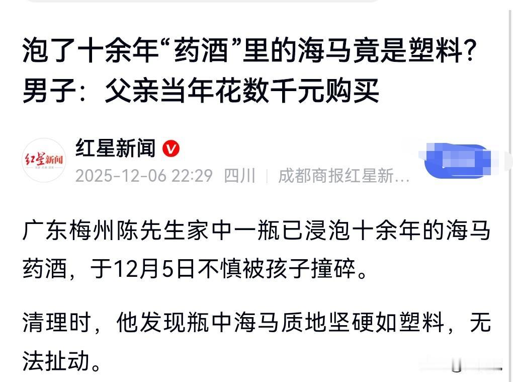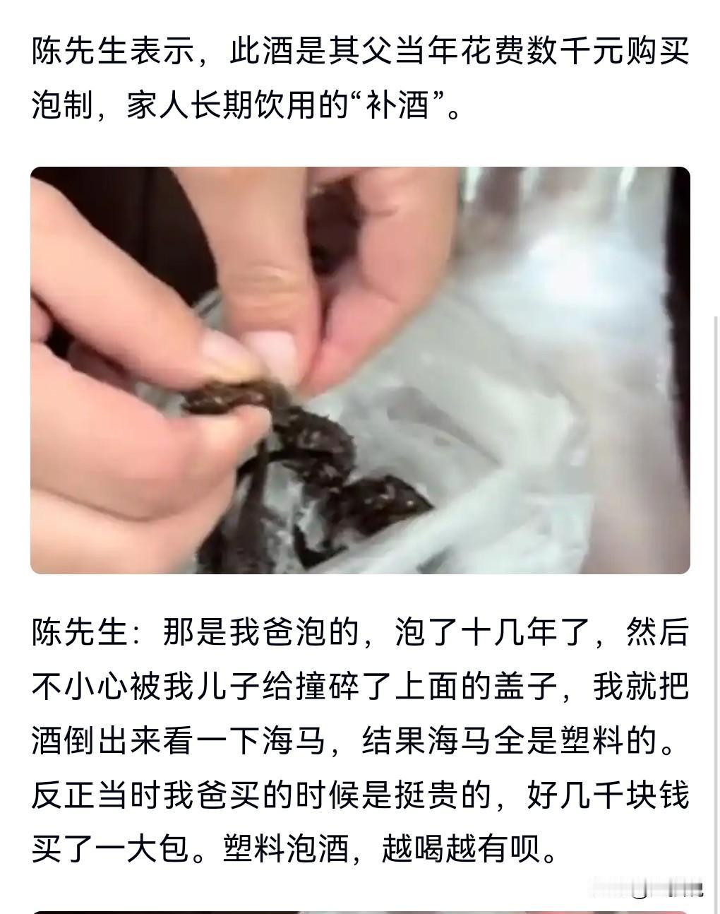 这真的是太坑人了,要不是家里的小孩子打破了,那这家人还蒙在鼓里。 12月7日我在网上看到这么个事情。 药酒里泡了十余年的海马竟是塑料。 本以为喝的是泡海马的酒,没想到竟然是塑料做的。 这真是太扎心。 这样的商家实在是太缺德了。 当年花几千块钱买的,没想到是塑料。 酒都已经不想要了,倒掉了。