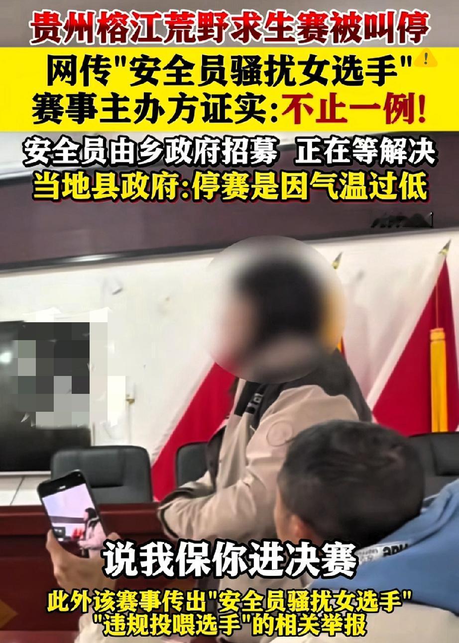 这哪是荒野求生? 分明是人性大考! 榕江这档比赛才开4天就停赛,安全员的操作真让人作呕! 本该护选手安全的安全员,竟趁黑拉女选手的手,用火腿肠和决赛名额搞潜规则,还拿“老表管山”施压。 被拒绝后就耍阴招,偷偷灭了人家的火,让选手白忙活3小时重燃,生理期要卫生巾也只给1个,转头还骂“不知好歹”。 收着1280元报名费,号称保障安全,结果安全员成了最大隐患,这哪是比赛,分明是给权力寻租留了空子。 真正的荒野考验的是生存能力,而这场闹剧暴露的,是某些人藏在规则背后的自私与卑劣。 赛事停了、退费在统筹,但这样的“潜规则”该怎么杜绝? 你觉得该怎么约束这类岗位的权力?来聊聊~