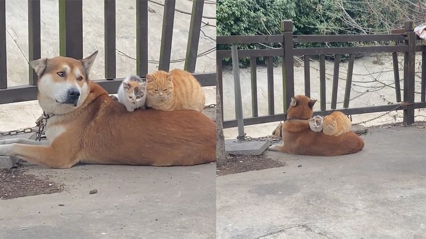 【猫咪母子冻得直哆嗦,趴狗背上取暖,狗狗:我是它娘俩的坚强后盾】12月3日,河南信阳,气温突降两只猫咪爬狗背相互取暖。拍摄者毕先生表示:感觉狗狗看面相挺和善的,和猫咪它们应该是好朋友,因为天气突然变冷了,可能猫咪觉得金窝银窝比不上狗窝吧,都爬在狗背上取暖,狗狗也不闹不生气,狗狗:多床被子,猫咪:多床褥子。
