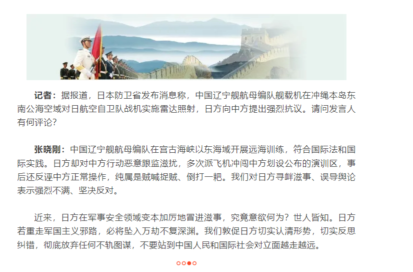 #国防部回应日方滋扰辽宁舰训练#【国防部新闻发言人张晓刚就日炒作我辽宁舰航母编队舰载机雷达照射答记者问】#国防部回应日本自卫队滋扰辽宁舰训练#记者:据报道,日本防卫省发布消息称,中国辽宁舰航母编队舰载机在冲绳本岛东南公海空域对日航空自卫队战机实施雷达照射,日方向中方提出强烈抗议。请问发言人有何评论?张晓刚:中国辽宁舰航母编队在宫古海峡以东海域开展远海训练,符合国际法和国际实践。日方却对中方行动恶意跟监滋扰,多次派飞机冲闯中方划设公布的演训区,事后还反诬中方正常操作,纯属是贼喊捉贼、倒打一耙。我们对日方寻衅滋事、误导舆论表示强烈不满、坚决反对。近来,日方在军事安全领域变本加厉地冒进滋事,究竟意欲何为?世人皆知。日方若重走军国主义邪路,必将坠入万劫不复深渊。我们敦促日方切实认清形势,切实反思纠错,彻底放弃任何不轨图谋,不要站到中国人民和国际社会对立面越走越远。