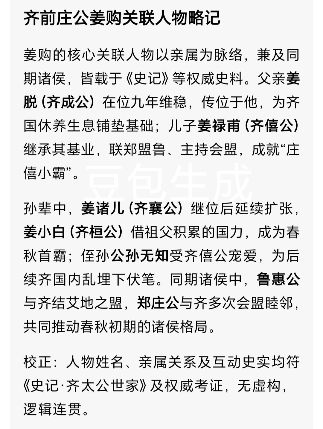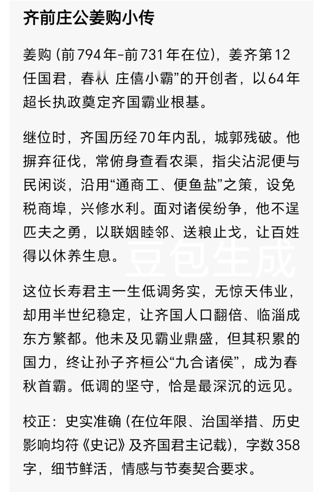 齐前庄公姜购:静守64年,为齐国霸业筑牢根基 他继位时,齐国深陷君位纷争,朝政动荡、民生凋敝。谁也未曾想,这位低调的宗室君主,会用64年的坚守,为齐国铺就通往春秋首霸的道路,成为乱世中最沉默却最坚实的支柱。 公元前795年,齐国都城临淄(zī)宫殿内,紧张气息弥漫。刚历经多轮权力更迭的贵族们,将目光投向宗室成员姜购。彼时的齐国,数代君主统治短暂、内斗频繁,《史记·齐太公世家》记载:“厉公暴虐,齐人杀之,立其子赤,是为文公。文公卒,子成公脱立。成公卒,子庄公购立。”这段看似平稳的传承背后,暗藏无数矛盾,姜购接手的,是个满目疮痍的烂摊子。 一、蛰伏静守,力挽狂澜 面对残破的国家,姜购没有急于求成,而是以超常耐心确立“停止折腾,恢复元气”的核心思路。 对内,他推行休养生息:减轻赋税让民众喘息,温和整顿吏治避免激化矛盾,以必要妥协安抚贵族换取政治稳定。对外,坚持“睦邻少事”:与诸侯正常往来不主动挑事,边境纠纷优先谈判,盟会中保持低调不争盟主。这种“不霸气”的风格,正是乱世中最务实的选择——稳定远比虚名重要,恢复元气远比盲目扩张迫切。 二、被低估的治国智慧 姜购的高明,藏在三个易被忽视的细节里: 其一,储备基础人才。他在位期间完善官制,建立稳定行政体系。虽无明确史料记载提拔的人才,但从其子齐僖公继位后能快速开展外交、其孙齐桓公能得管仲辅佐来看,正是这一时期的人才积累,为后世霸业铺路。 其二,深耕经济根本。齐国素有“鱼盐之利”,却因内乱导致盐渔产业破败。姜购着力恢复基础产业,考古证实,这一时期齐国沿海盐场持续生产,还利用地下卤水制盐提升效率,为国家积累了宝贵财富。 其三,巧解宗室矛盾。作为内乱亲历者,他深知宗室争斗的危害,通过联姻、权力平衡压制纷争。虽未根本解决问题(直至齐桓公时由管仲破解),但为齐国赢得了数十年稳定恢复期。 三、长寿统治的双面影响 姜购在位64年(公元前795年-公元前731年),是春秋战国时期在位最长的国君之一,影响深远。 正面来看,长期稳定让齐国经济复苏、人口增长,从“危邦”成长为实力雄厚的诸侯国,史伯赞其为“姜、嬴之隽”。负面影响则是政策惯性,晚年出现官僚老化、改革动力不足的问题,为齐僖公后续调整埋下伏笔。但总体而言,利远大于弊,没有这64年积累,齐僖公的“小霸”与齐桓公的“首霸”都将无源可寻。 四、谥号“庄”的历史认可 姜购去世后谥号为“庄”(shì)。按《谥法》:“兵甲亟(qì)作曰庄,睿圉(yǔ)克服曰庄,胜敌志强曰庄”。这一谥号看似与他“少用兵”的风格不符,实则精准概括其功绩——他以智慧克服内乱、抵御外患,为齐国筑牢安全屏障,更奠定了后世“胜敌志强”的基础。这份谥号,是对他守成中兴之功的最高认可。 五、历史链条的关键一环 姜购的父亲齐成公在位仅9年,未能彻底稳定局势;儿子齐僖公在位33年,凭其积累的国力开创“小霸”局面;孙子齐桓公在位43年,成就“九合诸侯,一匡天下”的霸业。 姜购的64年,正是承上启下的关键:结束长期动荡,修复国家创伤,积累人才、经济与政治基础。若没有他的“静守”,齐国或许早已在内乱中衰落,难有后续的霸业辉煌。 公元前731年,姜购去世。他一生低调,史料鲜有详细记载,如今临淄齐国故城遗址也无其时代的明确遗迹。但遥想齐桓公称霸中原的霸气时,不该忘记这位沉默的奠基者——他用一生隐忍与坚守,完成了最艰难的“筑基工程”。 守成,有时比开拓更需智慧与勇气。在急于求成的时代,姜购的故事提醒我们:慢下来打牢基础,才是长远成功的最佳路径。 你觉得历史中,开拓疆土的雄主与稳固根基的守成之君,谁更可贵?欢迎在评论区分享看法!东周列国志 齐僖公之父 齐前庄公