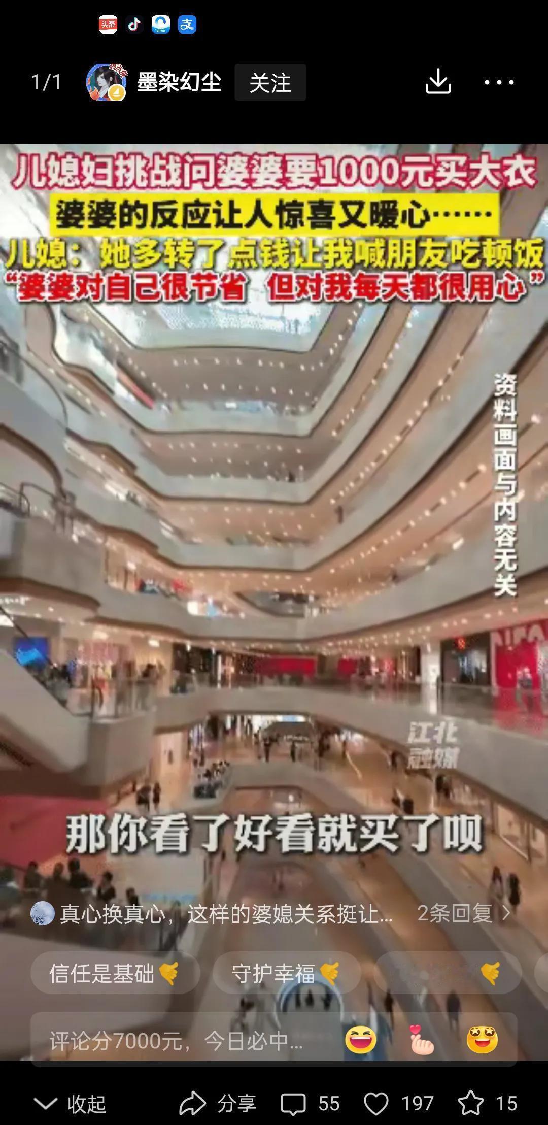 江苏南京,女子看中一件大衣,需要1000元,问婆婆要钱买。没想到,婆婆跟她说: “喜欢就买呗,钱不够,我转给你。”最后婆婆给她转了1200块钱。 手机屏幕上还留着转账界面,收款方昵称是“我的小棉袄”——这是江苏南京一位婆婆存的儿媳备注。1200元的转账记录旁,她特意补了条消息:“买完大衣剩下的,买点糖吃。” 这多出的两百块,不是计算好的补贴;是当妈的想起闺女上次说想买的护手霜,顺手添上的“零花钱”。手指在手机键盘上敲得飞快,连核对都没核对就按下了发送键——她怕晚一秒,儿媳喜欢的大衣就被别人买走了。 类似的“偏心”在山东一位婆婆身上更热闹。年底家庭聚会上,她从褪色的红布包里掏出五沓现金,往三个儿媳面前一推:“一万五,专款专用——给你们买新衣服、做头发,不准给老公花。” 这场景要是放在短视频里,评论区准会炸开锅。毕竟太多人习惯了婆媳间的“暗战”:你做的饭咸了是故意的,她没洗碗是甩脸色。可这两位婆婆偏不按剧本走。 南京的这位婆婆转账时,压根没算过“该不该给”。她只记得儿媳上个月逛商场时,盯着那件驼色大衣看了足足三分钟,眼睛亮得像落了星星——当妈的哪能让孩子眼里的光灭掉? 山东另一位90后儿媳就把这份光接住了。婆婆帮她带双胞胎女儿,每天凌晨五点就起床煮辅食,她每月雷打不动转3000元过去:“这不是工资,是我想让妈也买件喜欢的广场舞外套。” 婆婆起初把钱塞回她手里,说“一家人哪能算这个”,后来拗不过,偷偷存进了标着“孙女教育金”的银行卡里。抽屉里的存折本上,每笔3000元的记录旁,都画着个小小的笑脸。 要是较真翻开法律条文,这些钱的性质能吵上半天——是赠与还是借款?有没有附加条件?可在婆婆和儿媳的心里,这些数字早被揉成了一团暖烘烘的棉絮:她怕我冷,我怕她累。 为什么这样的故事总让人鼻子发酸? 因为那件1000元的大衣,早不是衣服了。它是婆婆塞进儿媳口袋里的“撑腰符”,是儿媳敢在婆家“撒娇”的底气,是把“外人”变成“自己人”的魔法。 有人说这是“幸运儿的故事”,可哪有天生的幸运?不过是婆婆先递出了橄榄枝,儿媳又稳稳接住了而已。就像山东那位发钱的婆婆说的:“人心换人心,四两换半斤——我对她好,她自然也对我好。” 手机屏幕暗下去时,南京的婆婆还在想:明天得问问她,大衣穿上合不合身。 当满屏还在演“婆婆藏起儿媳的快递”“儿媳抱怨婆婆做的饭”时,这些婆婆和儿媳正用最笨的办法——给钱、给爱、给真心——把日子过成了偶像剧。