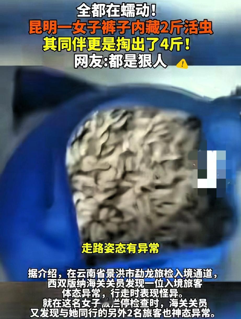 昆明这波操作太离谱! 女子裤子里藏2斤活竹虫,同伴掏出来4斤,全是蠕动的活虫—— 为了卖钱连膈应都顾不上了? 这竹虫是西双版纳特色美食没错,但偷偷藏在身上带入境,可不是“吃货执念”,是把生物安全当儿戏。 海关查出来这6斤活虫,真要流入市场,谁知道会不会带外来病菌? 总有人觉得“小事儿不用管”,可生物入侵、违规携带物种的坑,往往就是这种“赚快钱”的心思挖出来的。 海关能从走路姿态看出异常,这敏锐度真该夸,但更该醒的是那些想钻空子的人:别为了点利益,把安全底线踩没了。 你见过最离谱的“藏东西”操作是啥?来评论区开开眼~