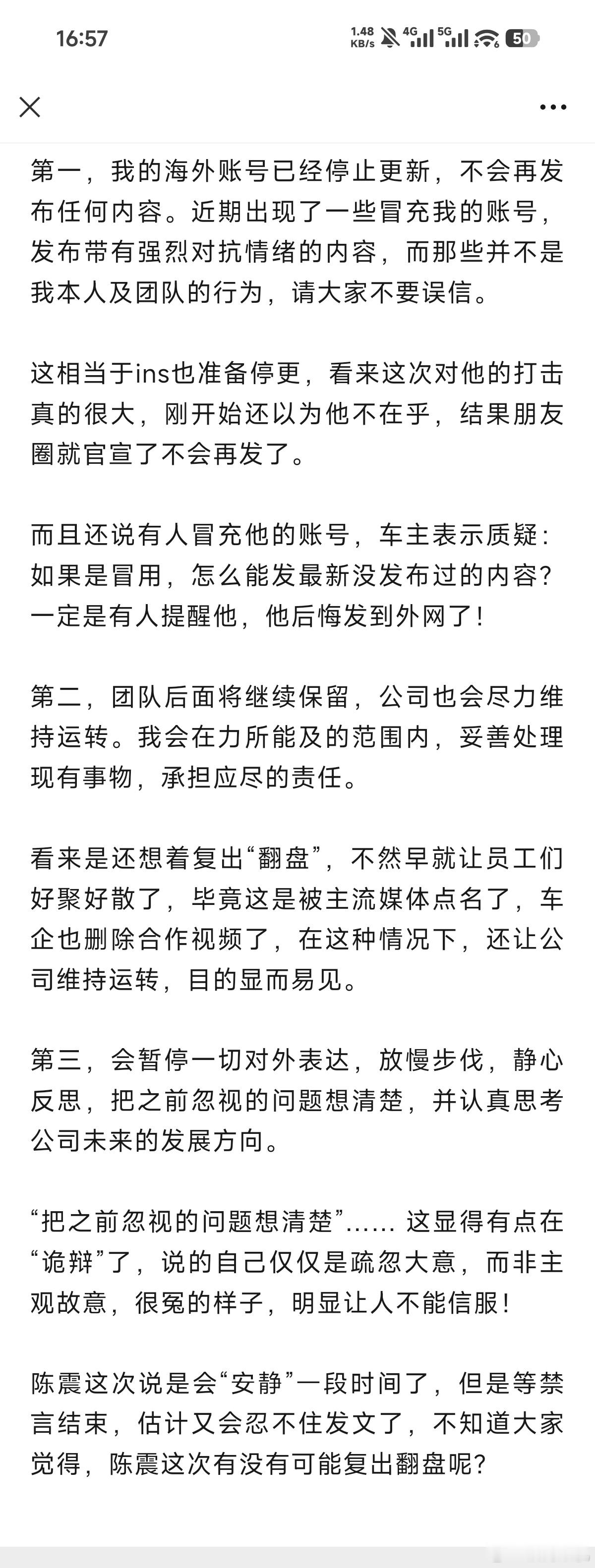 陈震朋友圈官宣海外账号停更,一些账号是冒充他的。陈震朋友圈发文