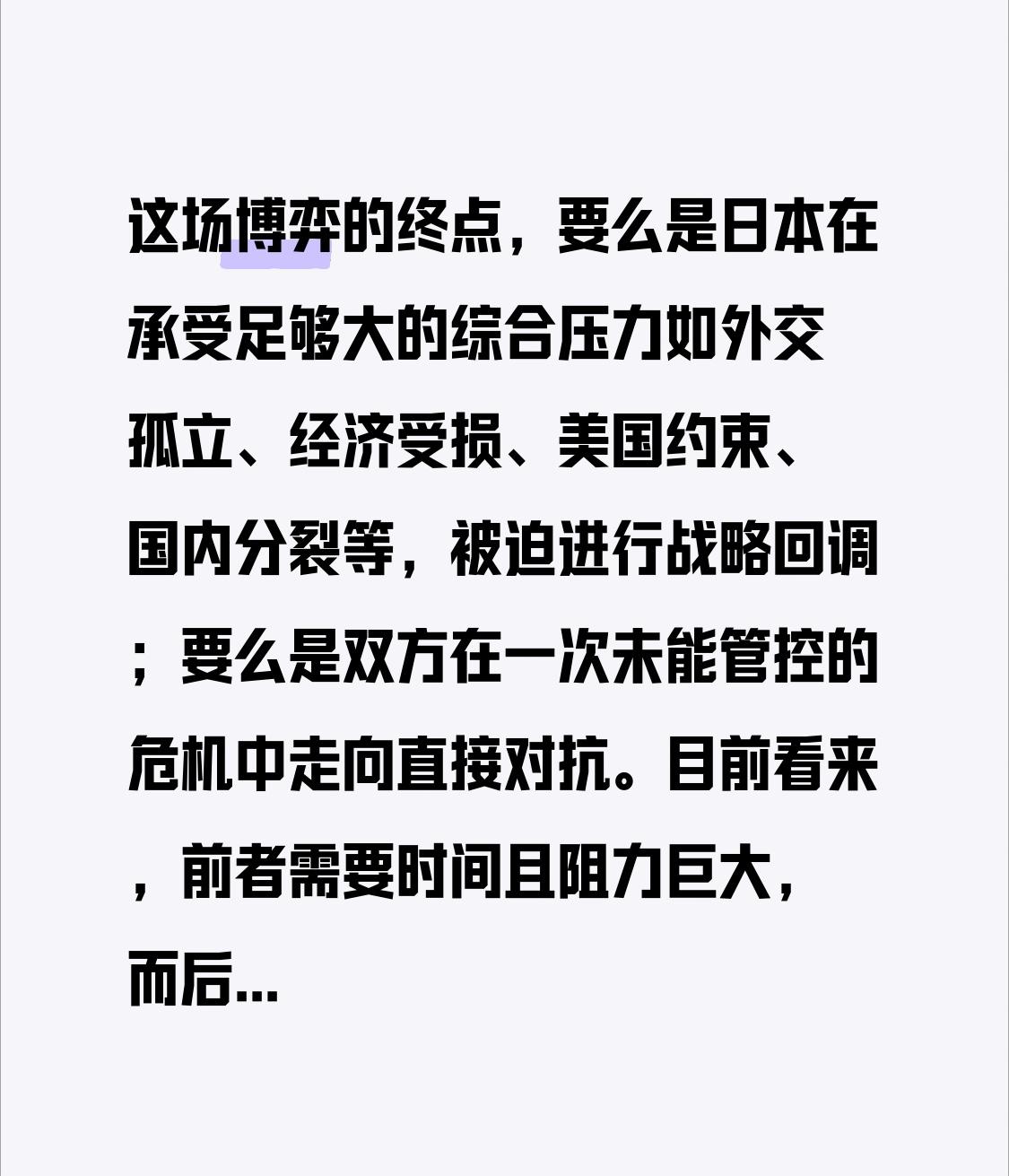 这场博弈的终点,要么是日本在承受足够大的综合压力如外交孤立、经济受损、美国约束、国内分裂等,被迫进行战略回调;要么是双方在一次未能管控的危机中走向直接对抗。目前看来,前者需要时间且阻力巨大,而后者一旦发生,将彻底改变东亚乃至全球的地缘政治格局。