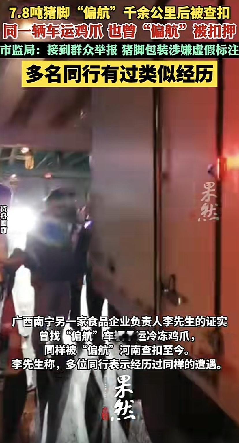 又是到河南!广西发货的一车鸡爪,目的地是湖南,结果跑到了河南,同样的货物被扣留了! 就在不久之前,媒体曾经报道,也是广西发货的一车猪爪,目的地是广东,结果跑到了河南,同样是货物被扣留了! 真的是非常有意思。这些有正规手续的货物,为什么最后都会被拉到河南省呢? 各位是怎么看的?欢迎评论区留言。