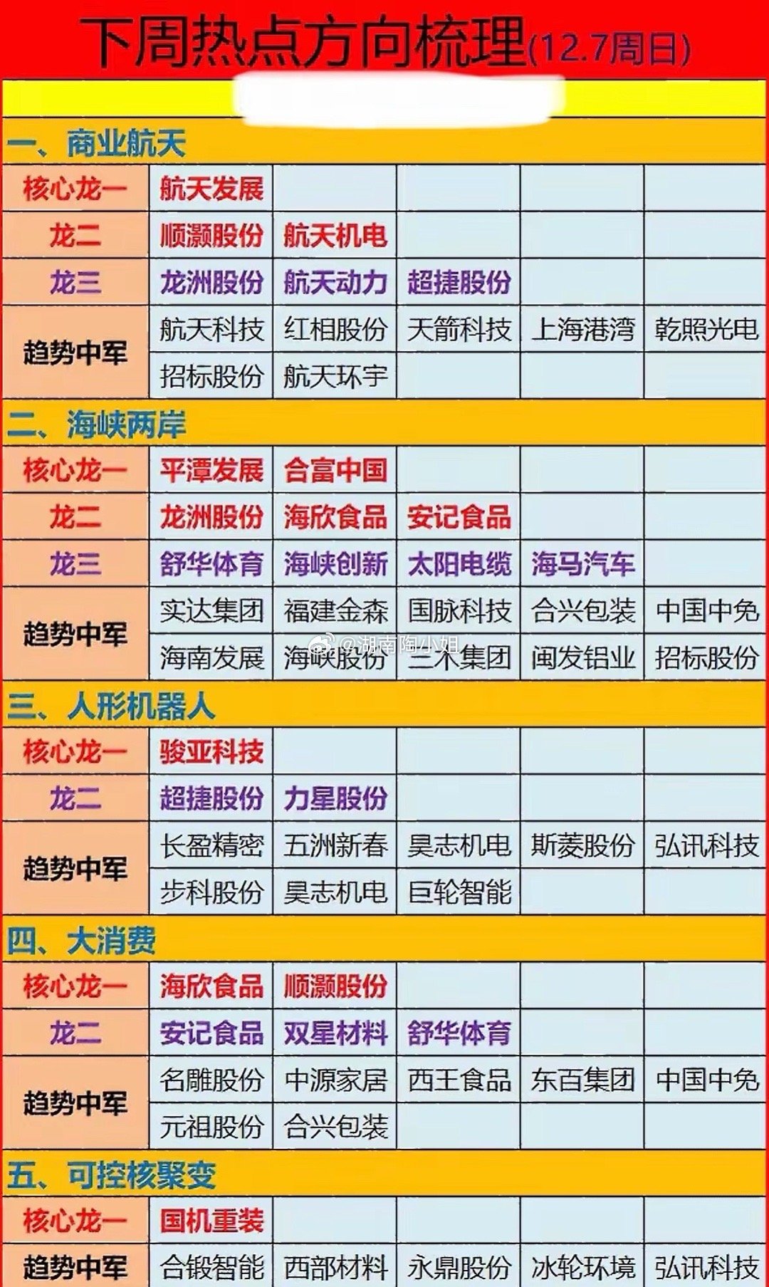 12月8日星期一5大方向梳理下周热点方向梳理,五大板块强势股一览!热点方向:商业航天、可控核聚变、大消费领涨,龙头股航天发展、国机重装、中国中免表现活跃,机器人及材料股跟涨。