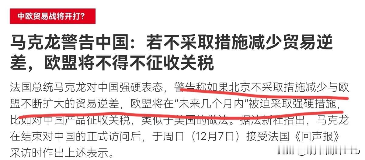 简直不敢相信,这话是从马克龙口中说出来!刚访华结束,马克龙口风变得非常强硬!12月7日,根据法新社报道,法国总统马克龙接受采访时表示,如果北京不采取措施减少与欧盟不断扩大的贸易逆差,欧盟将在“未来几个月内”被迫采取强硬措施,比如对中国产品征收关税,类似于美国的做法。 马克龙声称:中国正在“冲击”欧洲工业和创新模式的核心,而欧洲的传统优势在于机床和汽车工业。为了减少与中国的贸易逆差,欧洲必须接受中国的投资。我们不能一直进口,中国企业必须来欧洲投资。中国在欧洲的投资不应具有“掠夺性”,即不能以追求霸权和制造依赖为目的。 很显然,马克龙的这一番表态,语气非常的强硬。从马克龙的角度而言,马克龙有自己的想法,这很正常。但是,从我们的角度而言,我们会投资欧洲,但是我们绝不接受强制性的对欧投资,这应该遵守市场原则。而至于贸易顺差问题,中国并不单方面追求没有顺差,我们一直是欧洲企业的大客户。更为重要的是,如果法国真希望平衡贸易顺差,法国应该以客观公正的立场,呼吁荷兰等国家放开光刻机等对华出口限制。 法国不能一方面要求平衡贸易,一方面对于欧洲对华出口限制视若无睹。再者,我们需要提醒法国的是,以关税战对我们进行威胁,绝不是中欧相处之道。欧洲不能把自身需要解决的问题,都当成是我们的问题。欧洲更应该做的就是提振自身竞争力,而不是对我们无端指责。对于马克龙的硬话,这确实让人感到非常的意外,但不管局面会如何发展,我们的做法都将会是听其言而观其行。
