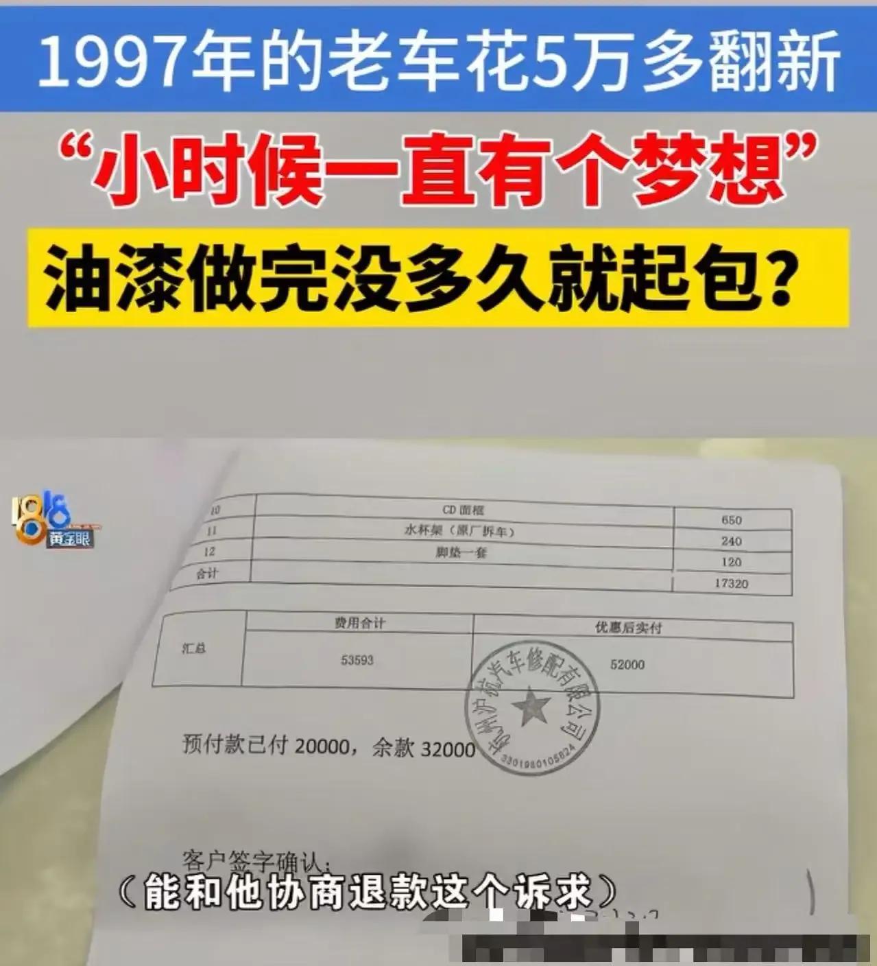 浙江杭州,男子年轻时一直有个梦想,就是开上1997年产的丰田佳美!为了实现了梦想,他 2013 年花 1 万 5买下了这台老爷车,现在想让这辆车开得更久,5 月份又花 52000 元 进行翻新整备。可开了几个月后,就出现油漆起包等问题,而维修店老板的说法,让他接受不了! 一个普通男子的梦想,却因为一辆老车,演绎出一场关于坚持与失望的真实人生。你是否也曾为了一个梦想,拼尽全力?他,年轻时的梦想是开上那台1997年产的丰田佳美——一辆或许在别人眼中毫不起眼的老车,却承载着他对青春的记忆和对未来的期待。 为了这个梦想,他用毕生积蓄的1万5千元买下了它。那时的他,或许满怀希望,期待着这辆车能陪伴自己走过更多的岁月。2013年,他花了更大的心思——又投入52000元,进行了全面的翻新整备。每一分钱都像是在为梦想添砖加瓦,每一次修复都像是在追忆那段青春的光影。 然而,梦想的路似乎并不总是平坦。几个月后,问题接踵而至:油漆开始起包、车身出现裂痕,修理店的老板却说:“这是正常的老化现象,不用担心。”但对于他来说,这不是普通的老化,而是梦想逐渐被现实磨灭的痛苦。 他难以接受,心里充满了疑问:为什么花了那么多钱,结果还是这样?是不是自己被忽悠了?还是说,梦想的实现,从来都不是一帆风顺的?更令人愤怒的是,维修店的老板似乎在推卸责任,态度敷衍,仿佛在告诉他:这就是老车的命运。 这场“梦想与现实”的碰撞,让我们不禁深思:在这个快节奏、追求新潮的时代,坚守一份旧梦到底值不值得?我们是否也像他一样,为了某个心中的理想,甘愿付出全部,却在途中遇到各种难题与质疑? 其实,故事的背后隐藏着更深的人性:那份对过去的怀念,对美好时光的留恋,以及在失望中依然坚持的勇气。我们每个人或许都曾有过“老车”般的梦想——那些年少时的梦想,或许已经被现实磨平了棱角,但只要心中还存有一丝希望,就值得我们继续前行。 这不仅仅是一辆老车的故事,更是一面镜子,映照出我们每个人的梦想与坚持。面对现实的残酷,我们该如何抉择?是放弃,还是继续坚守?答案,也许就藏在你我心中那份未曾熄灭的火焰里。 读到这里,你是否也在想:如果是你,你会选择放手,还是坚持?在这个充满变数的时代,或许我们都需要一份勇气,去面对那些“起包”的油漆,迎接未来的每一次挑战。因为,梦想从不曾远离,只要我们心中还怀揣希望。佳美丰田