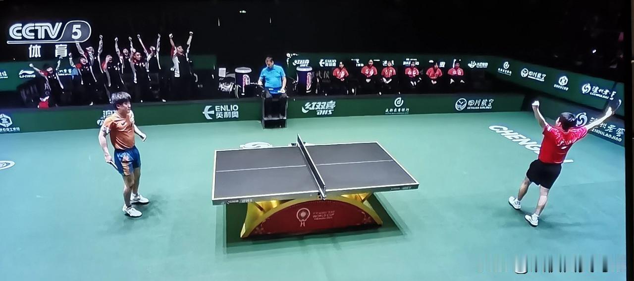 这张图片应载入乒乓史册 右侧红队服小伙子高举双手庆祝胜利 右侧教练席上一片红色却死寂一片! 左侧黄队服小伙子失落的呆呆站着 左侧教练席上欢呼的双手如小树林。 胜利与失败——错落有致!