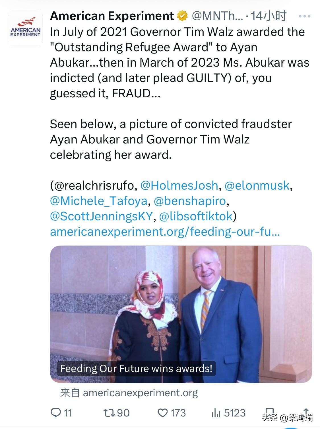 2021年7月,明尼苏达州州长蒂姆·沃尔兹向阿扬·阿布卡尔颁发了“杰出难民奖”……然后,在2023年3月,阿布卡尔女士被指控(后来认罪)的罪名,你猜对了,是欺诈…… 照片为被判犯有诈骗罪的阿扬·阿布卡尔和州长蒂姆·沃尔兹庆祝她获奖的照片。 2021年7月,阿扬·阿布卡尔(Ayyan Abukar)因其在明尼苏达州索马里裔社区中,通过她创立的非营利组织“索马里青年发展与家庭支持中心”(Somali Youth Development and Family Support Center),为青少年和家庭提供支持和指导方面的杰出工作,被明尼苏达州劳工和工业部(DLI)授予了“杰出难民奖”(Outstanding Refugee Award)。该奖项旨在表彰在社区服务方面做出显著贡献的前难民。 然而,到了2023年3月,阿布卡尔因涉嫌欺诈而被指控。相关的欺诈事实主要包括: 挪用联邦资金: 阿布卡尔被指控挪用了超过20万美元的联邦资金。 虚假陈述和伪造记录: 她被控提交虚假陈述和伪造的记录,声称其非营利组织为青少年提供了教育和就业相关服务,但实际上这些服务并未完全提供,或者参与人数被夸大。 个人使用资金: 指控称她将部分被指定用于社区项目的资金用于个人开支和利益。 这些指控导致了她之前的杰出贡献形象受到严重质疑。