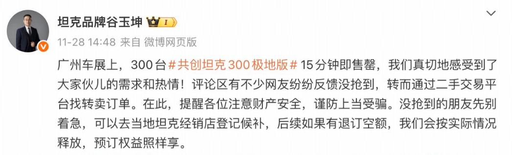 限量300辆15分钟全部售罄 坦克300极地版将于12月10日上市 日前,我们从官方获悉,坦克300极地版将于12月10日正式上市。 新车在2025广州车展首次亮相并开启预订,全球限量300辆,目前已全部售罄。 坦克300极地版由用户共创设计,采用“极地橙”配色,提供2.0T汽油及2.4T柴油发动机选择。 坦克300极地版共创计划共包含20多项细节元素,包含“极地橙”车身配色、“极地锋芒”专属拉花、前翼子板处“极地荣耀”身份徽章、“极地印记”车内座椅头枕烫印等。 坦克300极地版标配应对越野和极寒场景的配置,包括位于前包围中央的无线遥控绞盘(9500磅)、前风挡+雨刮喷嘴加热功能、AT全地形越野轮胎以及2.5吨的牵引资质。另外,该车还配备了车顶行李架和固定式侧踏板。 内饰方面,坦克300极地版与在售车型保持一致,配有14.6英寸悬浮式中控屏以及12.3英寸内嵌式全液晶仪表。 坦克300极地版沿用在售车型的动力系统,搭载2.0T汽油发动机和2.4T柴油发动机,最大功率分别为167千瓦和137千瓦,峰值扭矩分别为387牛·米和490牛·米,传动系统匹配9挡手自一体变速箱。 点个关注吧!汽节车社,车圈热点资讯每日一扫清!【来自懂车帝车友圈】