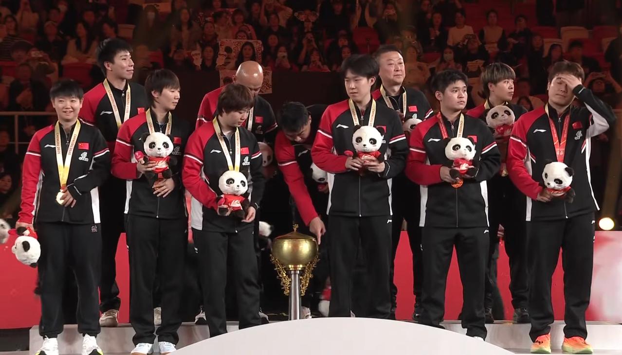 孙颖莎太可爱了,大概知道今天又要举杯,所以早早的跑到最边上,和鳗鱼站在一起。 果然要举杯拍照, 大头的脸也变的皱皱巴巴了。 而一边的孙颖莎露出了算准了的笑容, 哈哈, 国乒得奖太多了, 莎莎每次都不愿意拿奖杯, 这就是传说中的, 打球有千斤力, 颁个奖杯却嫌重, 说的就是莎莎!
