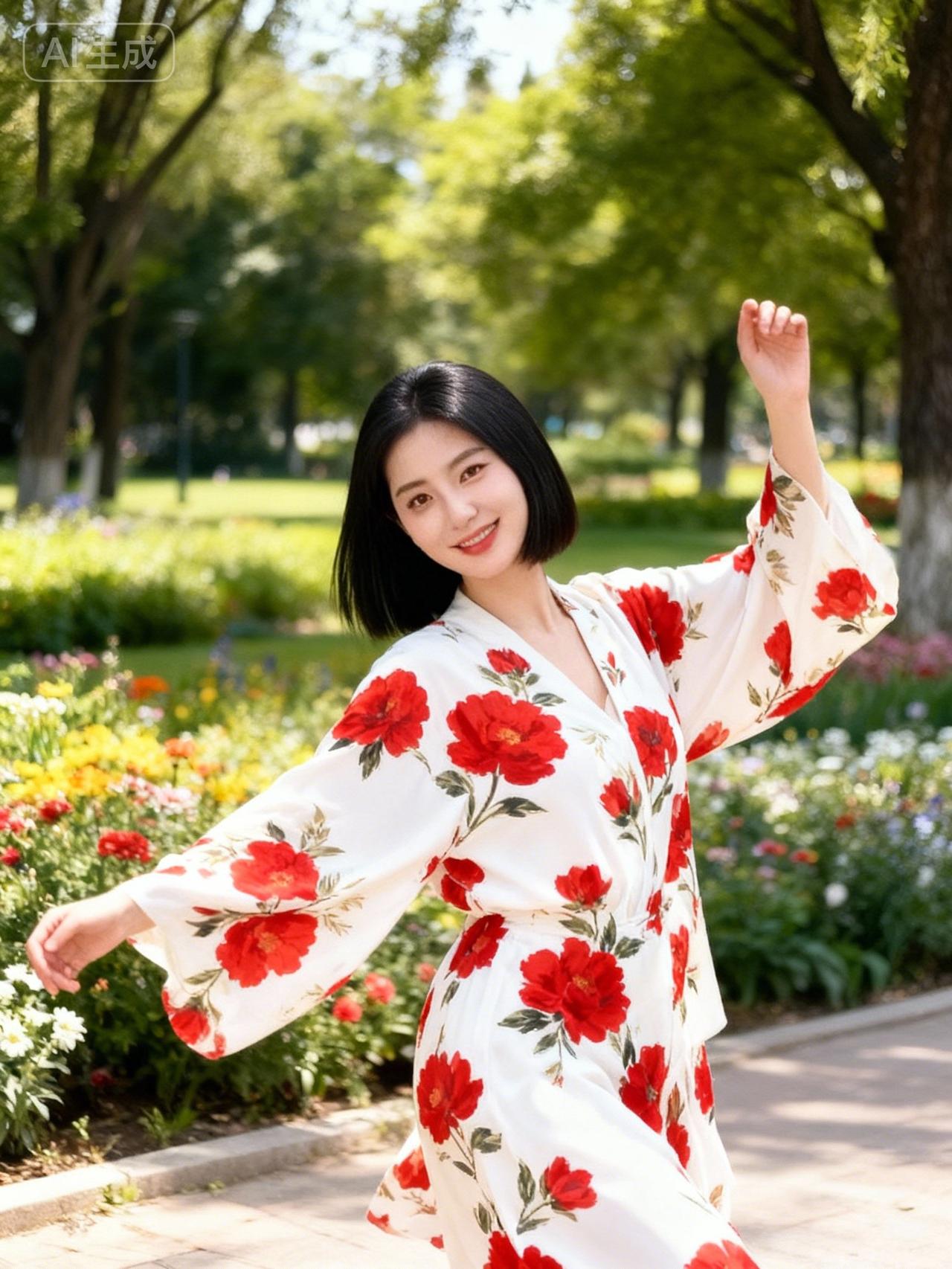 阳光明媚的公园里,穿着红色花朵连衣裙的美女,微笑着挥手,仿佛在迎接美好的一天。