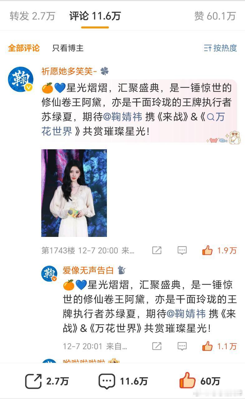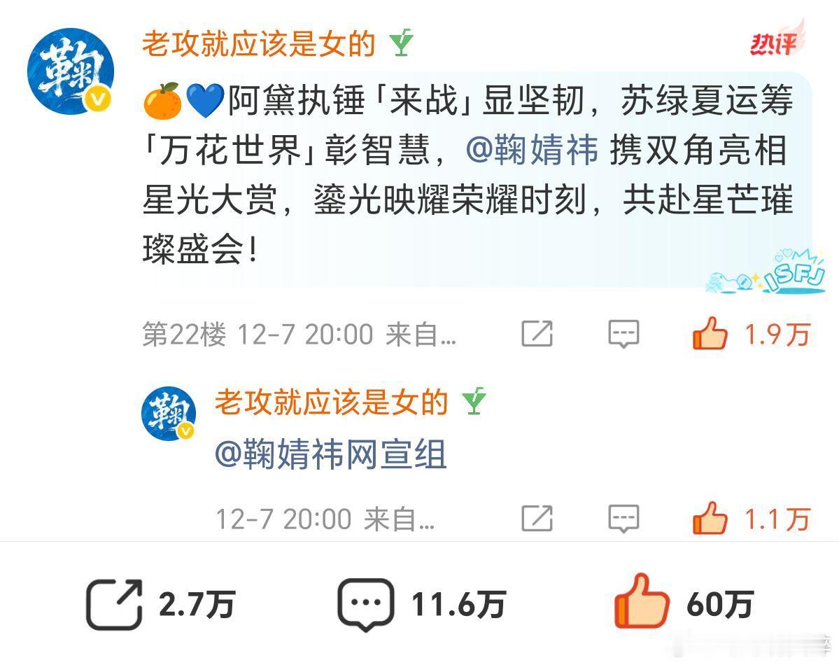 12.21星光大赏官宣阵容鞠婧祎粉丝提前练习42分钟60万总赞,1.9万内赞