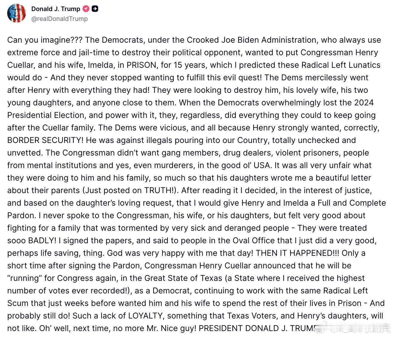 ‼️狗咬吕洞宾!特朗普发长发文痛斥自己曾施恩赦免的民主党人:“你们敢想象吗???在「骗子乔」政府领导下的民主党,一贯用极端武力和牢狱之灾来整死政治对手,他们竟然想把国会议员亨利·奎利亚尔和他妻子伊梅尔达关进监狱15年!——我早就预言过这些激进左翼疯子会干这种事,而且他们一直没死心,死死咬住这个邪恶目标不放!民主党人使尽浑身解数、毫不留情地追杀亨利,想毁掉他、他可爱的妻子、他两个年幼的女儿,以及他们身边所有人。2024大选民主党惨败、彻底失势之后,他们仍然不放过奎利亚尔一家,依旧凶狠恶毒——这一切就因为亨利坚决主张边境安全!他反对非法移民不受检查、不经审查地大规模涌入美国,反对帮派分子、毒贩、暴力重刑犯、精神病院病人,甚至杀人犯进入我们伟大的国家!他们对亨利和他家人做的事太不公平了,不公平到他的女儿们给我写了一封感人肺腑的信(我刚刚发在Truth Social上)。我读完那封信后,出于正义,也出于女儿们充满爱的请求,决定给亨利和伊梅尔达「完全彻底的赦免」。我从未和议员本人、他的妻子或女儿们通过话,但我觉得为一个被变态和病态之人折磨的家庭挺身而出,感觉非常好——他们被对待得太恶劣了!!!我签了赦免文件,在椭圆形办公室里对身边的人说:「我刚刚做了一件非常正确、也许还能救命的大好事,上帝那天一定为我感到高兴!」结果呢???赦免令签发没多久,亨利·奎利亚尔议员就宣布,他将再次以民主党身份在伟大的得克萨斯州(就是我创下史上最高得票纪录的那个州!)竞选国会议员,继续和几周前还想让他和他妻子下半辈子烂在监狱里的那帮激进左翼人渣共事——而且他们现在很可能还是这么想!如此缺乏忠诚!得州选民和亨利的女儿们绝不会喜欢这种做法。唉,好吧,下次再也不会做好人了!”热点现场海外编译精选海外新鲜事
